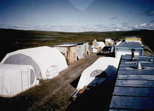 Trailers and tents line the old Toolik Lake construction camp airstrip as the original site of the University of Alaska Fairbanks research site at Toolik Lake in the late 1970s to early 1980s. The research site, then renamed Toolik Field Station, moved from the airstrip to the south side of the lake in 1984. Photo by Mike Abels/TFS