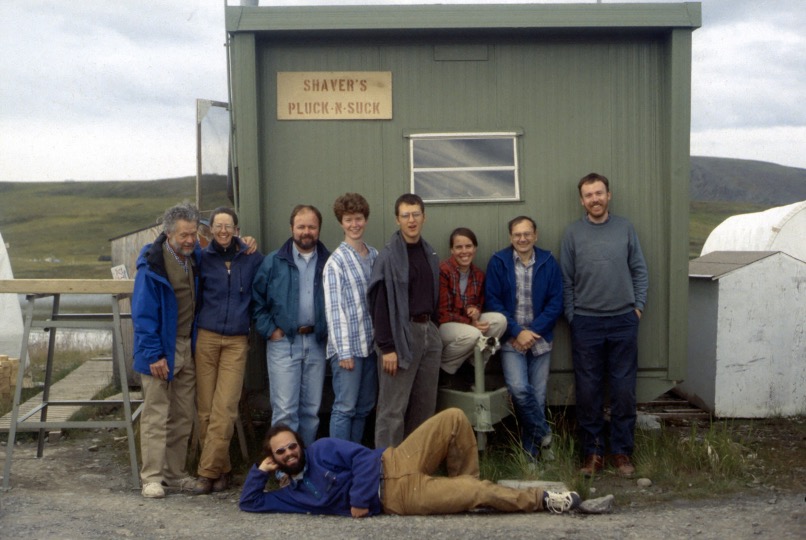 A research team, including Toolik Field Station's current science director Syndonia Bret-Harte, stands outside of a trailer lab in the 1990s.