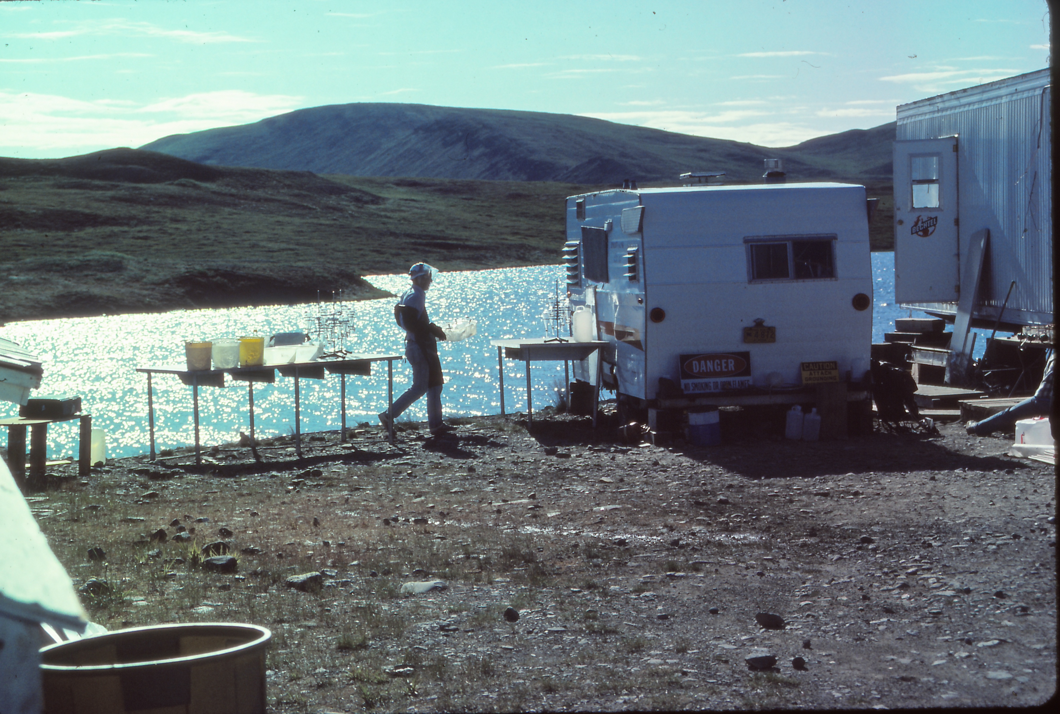 Researchers clean lab supplies outside of a trailer, which was converted into a mobile laboratory, on the shores of Toolik Lake in summer 1985. Photo by Jim Laundre