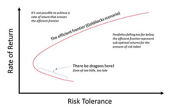 You can never get to zero risk, of course, because there are so many unknown factors the future obscures. But if you delay taking risk or choose to minimize all risk, it’s possible to land in a truly awful quagmire. That’s because rather than getting to zero risk and zero reward, the efficient frontier curves back on itself. Should you find yourself exploring this part of the frontier, you are in a very unfortunate predicament. Even if you belatedly start to take on additional risk, you will continue to slide down the curve and continue to lose out on the potential benefits that might have been available, had you acted sooner. That is the too little, too late scenario. The moral of the story is that a non-optimal decision made earlier is sometimes better than no decision at all.