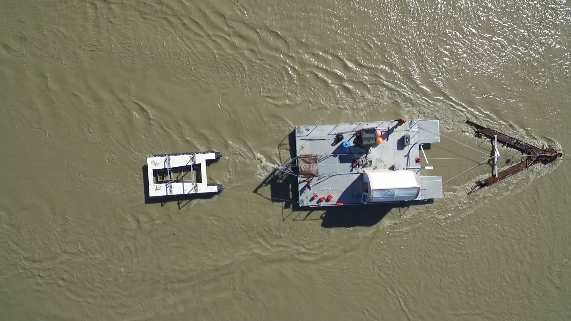 The research barge at the Tanana River Test Site near Nenana points upstream in 2023. Testing of prototypes at the site helps technology developers create systems that are ready for pilot deployments.
