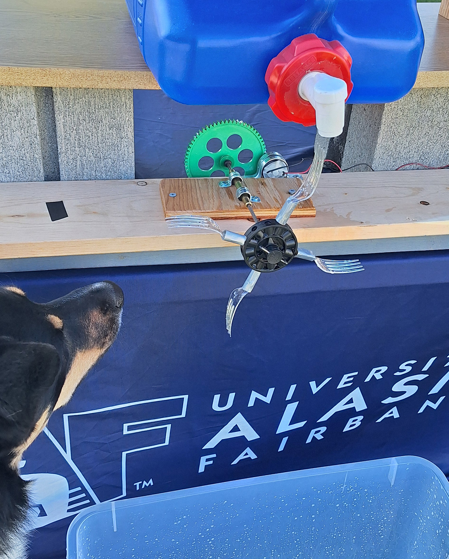 People were not the only visitors at ACEP’s booths. Arrow, the dog, checks out the hydrokinetic booth.