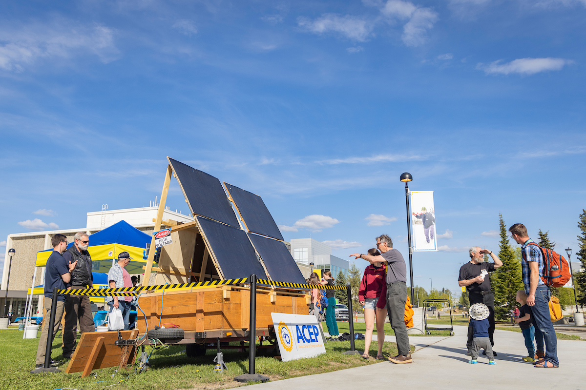 Attendees gather around solar panels at the ACEP booth to learn about solar technologies at the 2024 Arctic Research Open House.