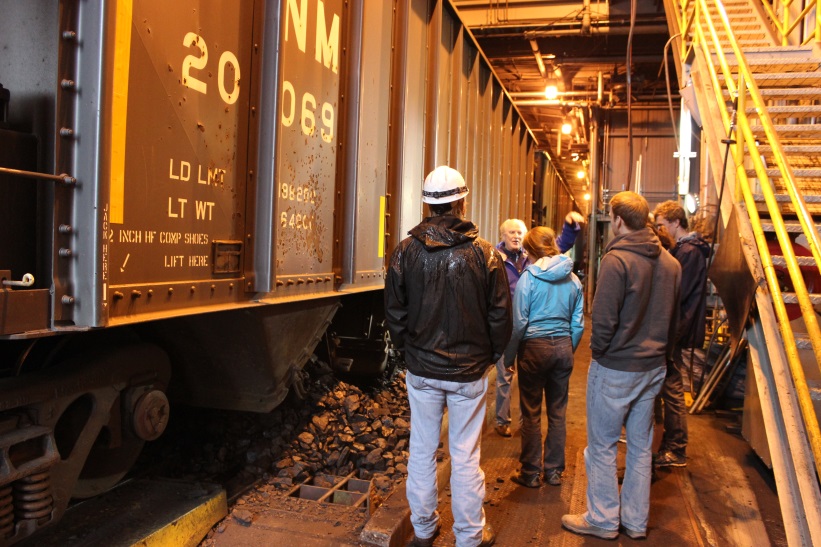 Photo: Buki Wright of Aurora Energy explains to ACEP interns and staff how the coal is offloaded from train cars and transported to the Power Plants boilers. Photo courtesy of MCassino, ACEP/UAF.
