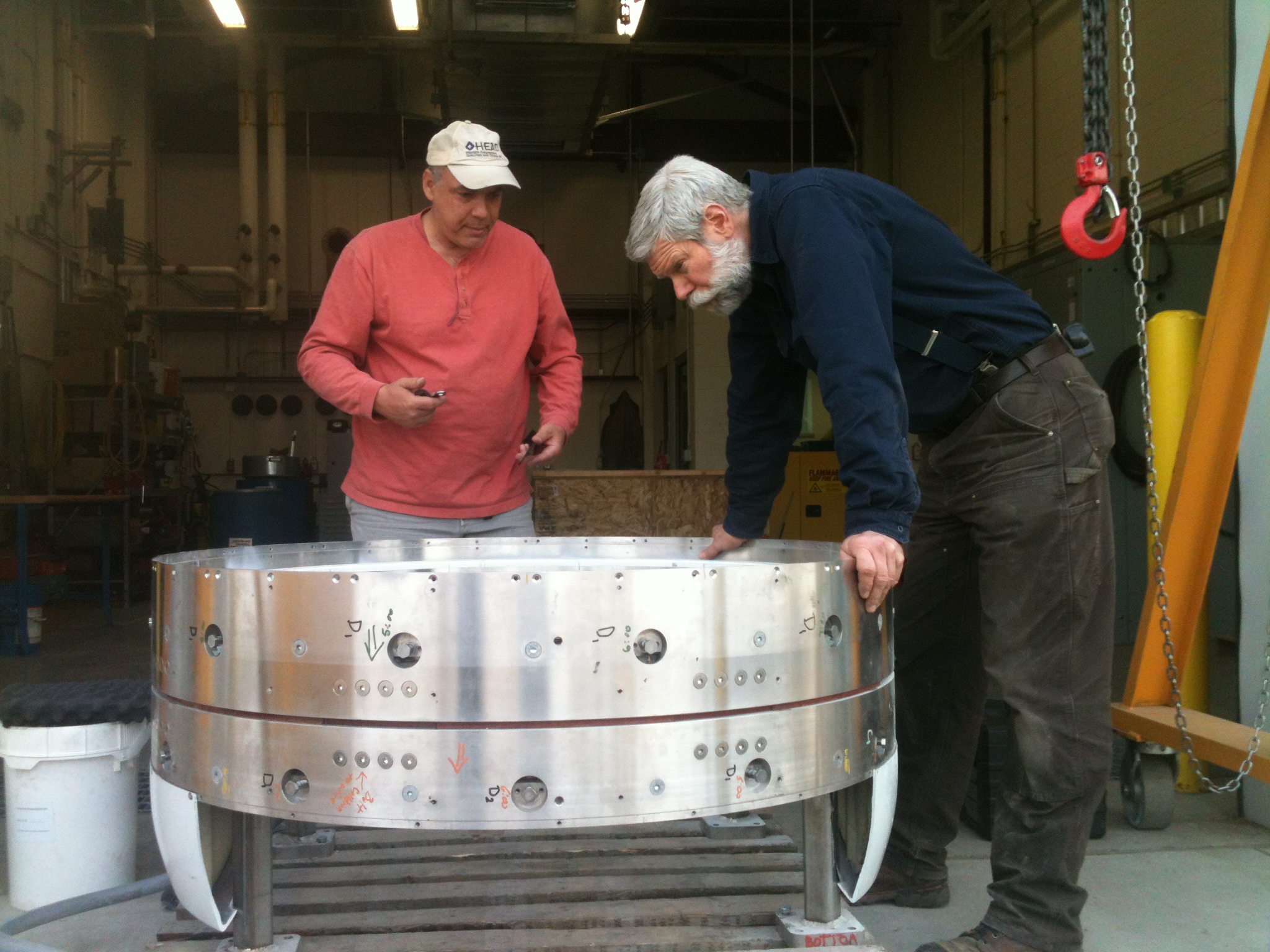 Ned Hansen (left) and David Light (right) pictured examining the Oceana turbine. Photo credit B. Sheets, ACEP/UAF.