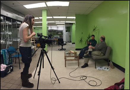 Photo: Molly Rettig operates the camera while Art Nash interviews Daisy Huang about biomass energy in Alaska. Photo credit M. Frey, ACEP/UAF.