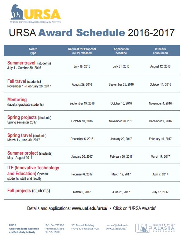 The UAF Undergraduate Researcher & Scholarly Activity 2016-2017 award schedule has been released.