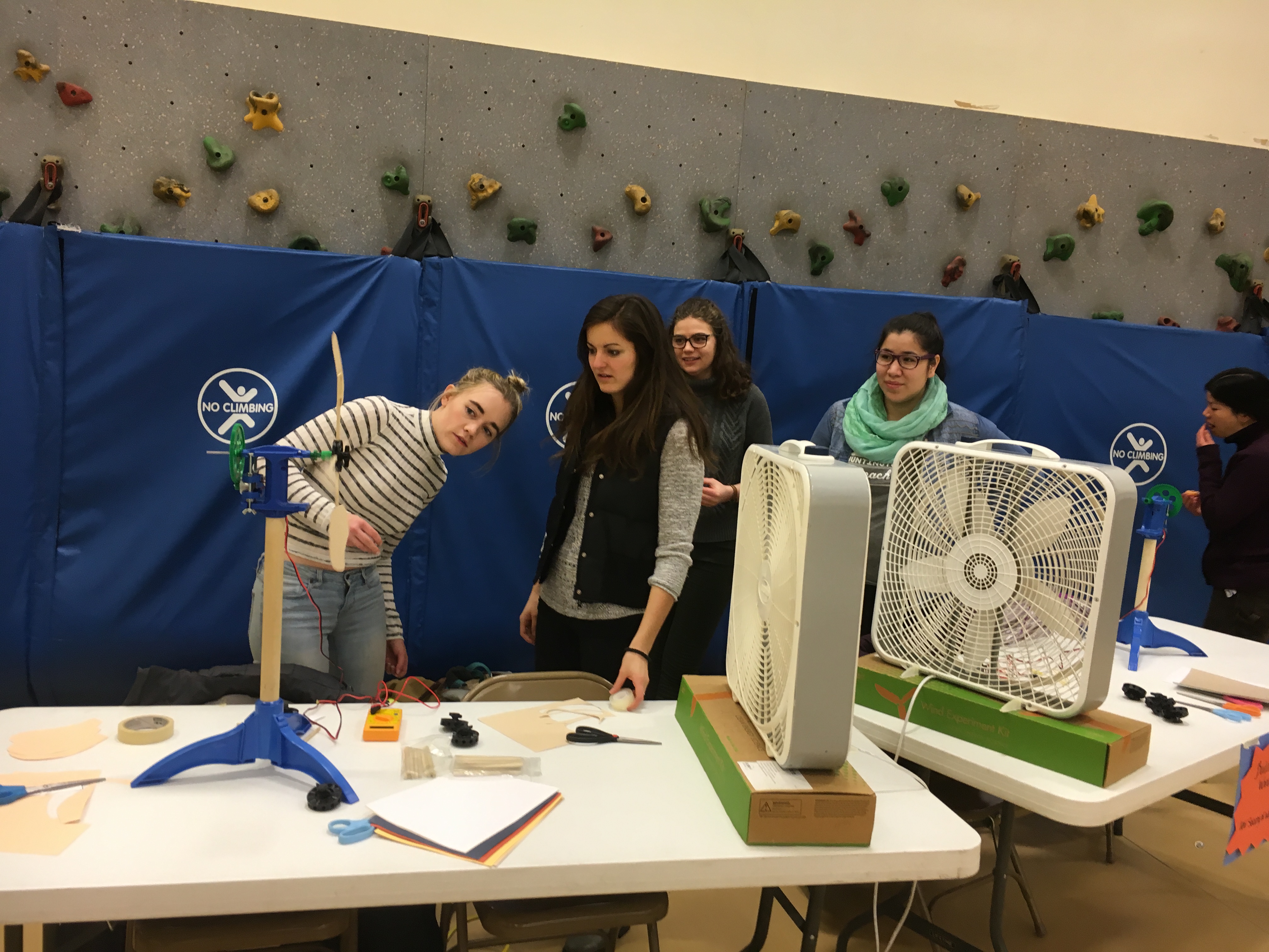 Dr. Huang and the SWE members led the students in cutting different wind turbine blade designs out of card stock and, when mounted onto generator hubs, tested their designs for power generation. Students learned that different blade shapes and sizes generate varying amounts of power.