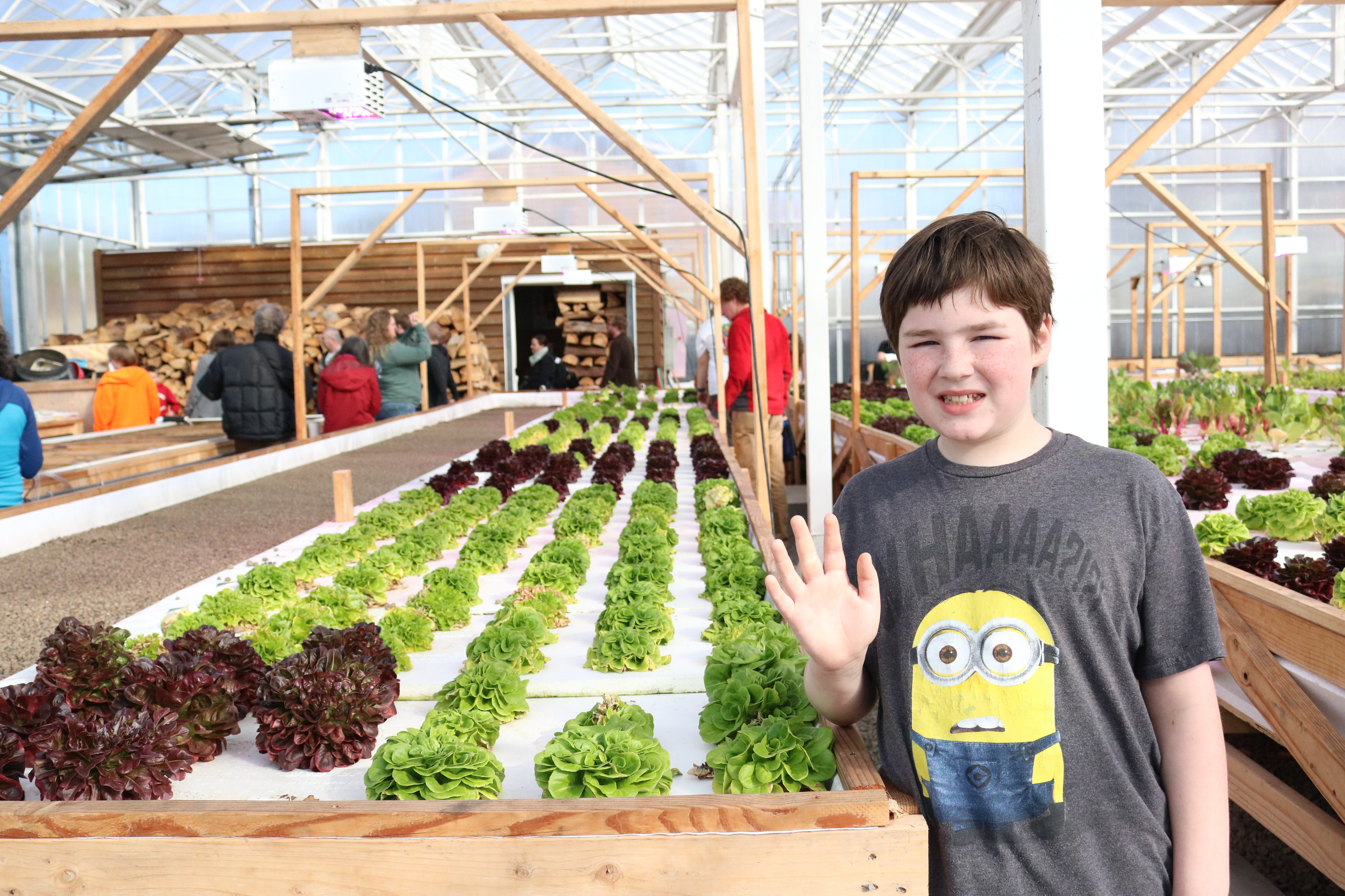 Coffman Cove Student stands with hydroponic lettuce during a tour of the SISD greenhouses. Photo by A. Byrd/ACEP.