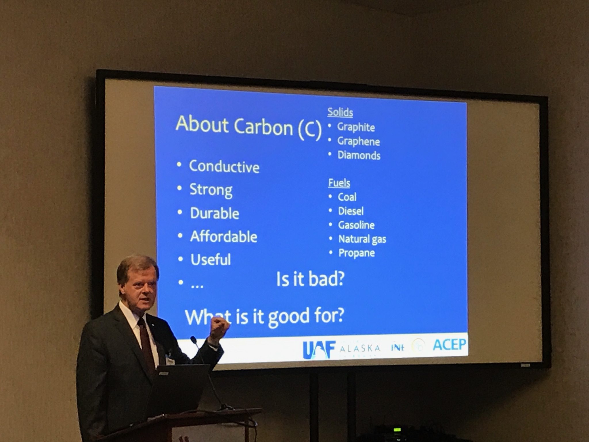 Roe gave two presentations during the meeting titled Monetizing Carbon Byproducts (opportunities associated with human-made and naturally occurring carbon byproducts) and Remote Energy Solutions in Alaska (aspects of Alaska's microgrid experience base and related regional collaboration opportunities).