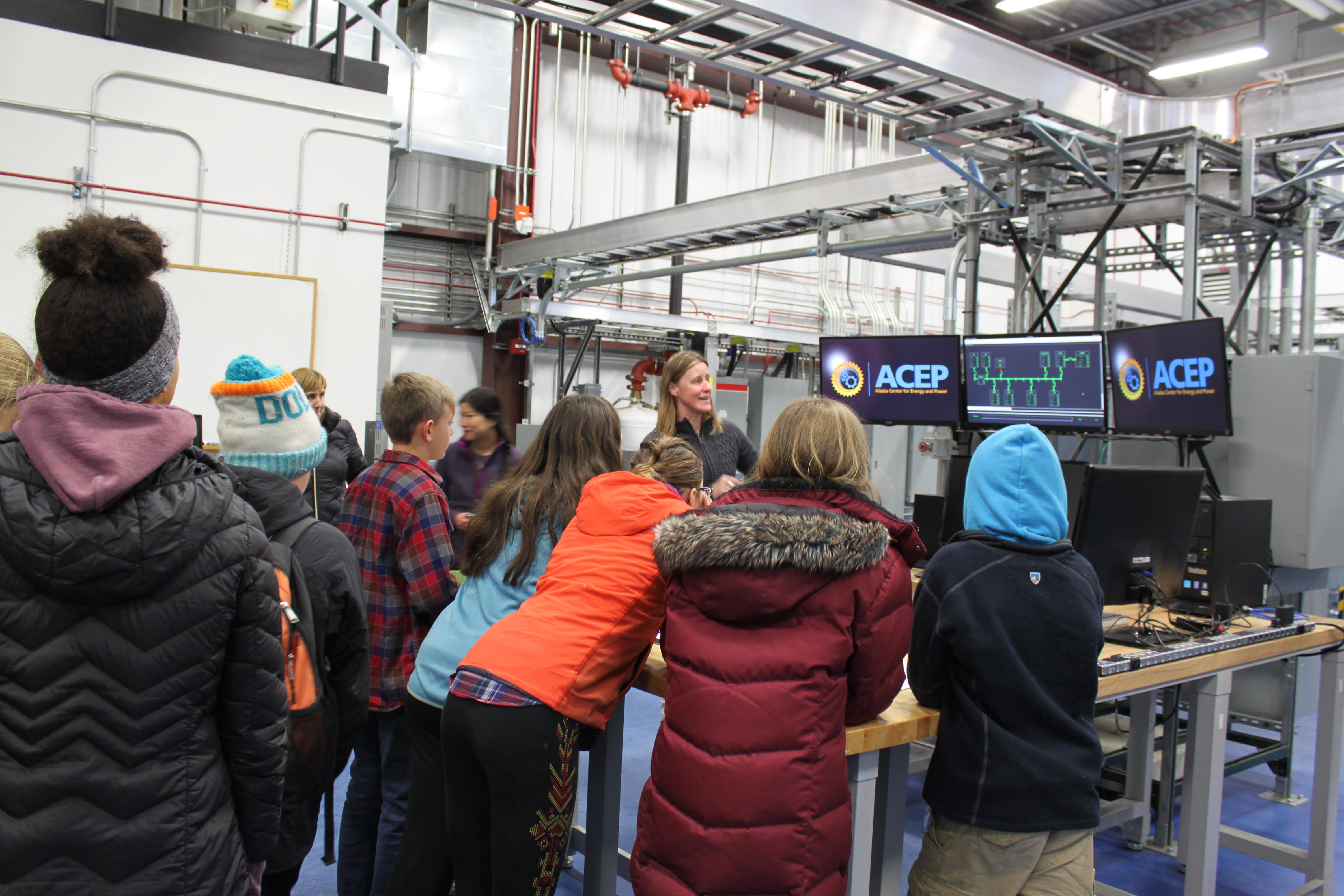 ACEP’s Heike Merkel shows Watershed Middle School students participating in the Future City Competition the control system for the Power Systems Integration Lab. Photo by Marcia Cassino/ACEP.
