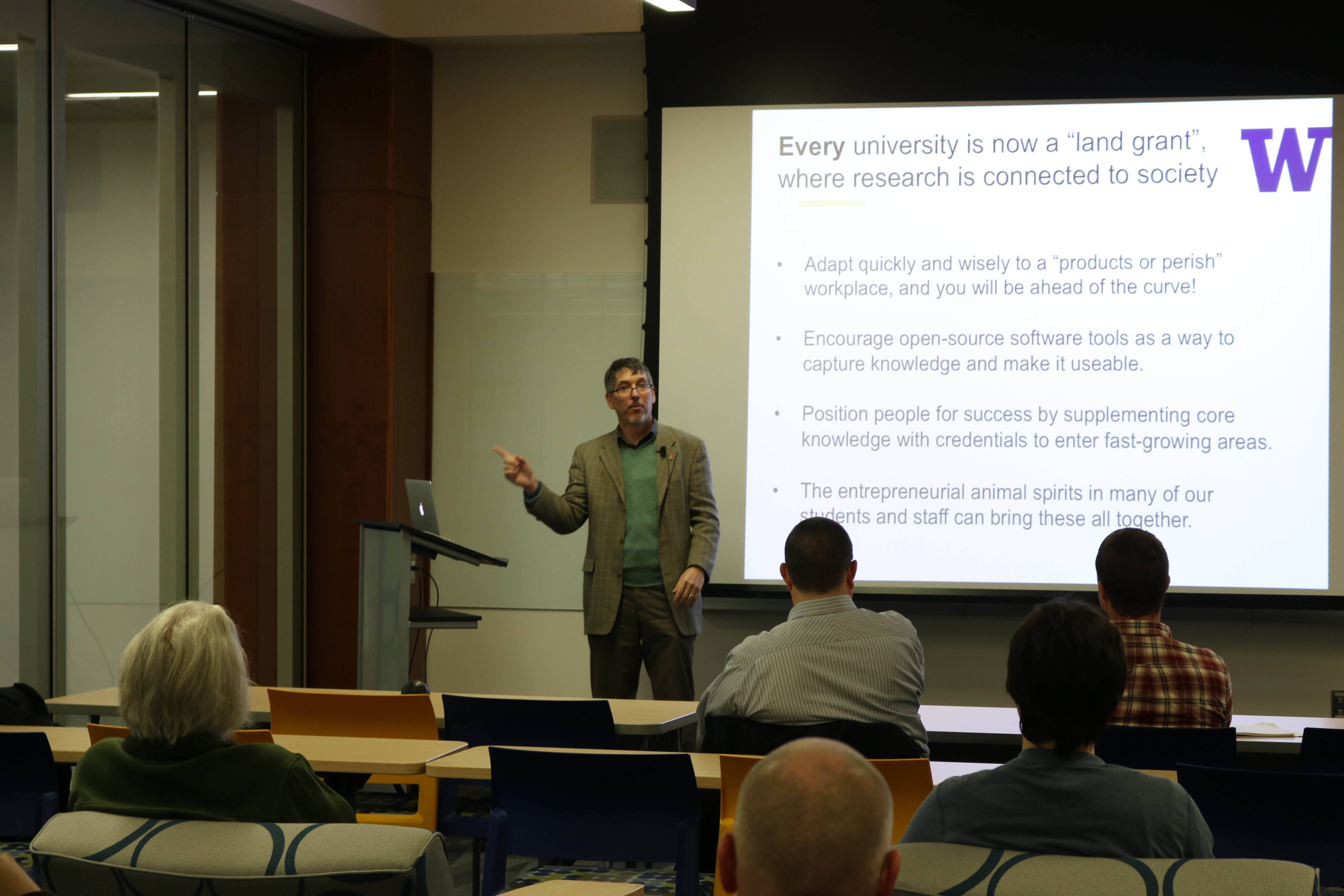 Photo: Dan Schwartz presents on his commercialization experience at UW. Photo by Amanda Byrd/ACEP.
