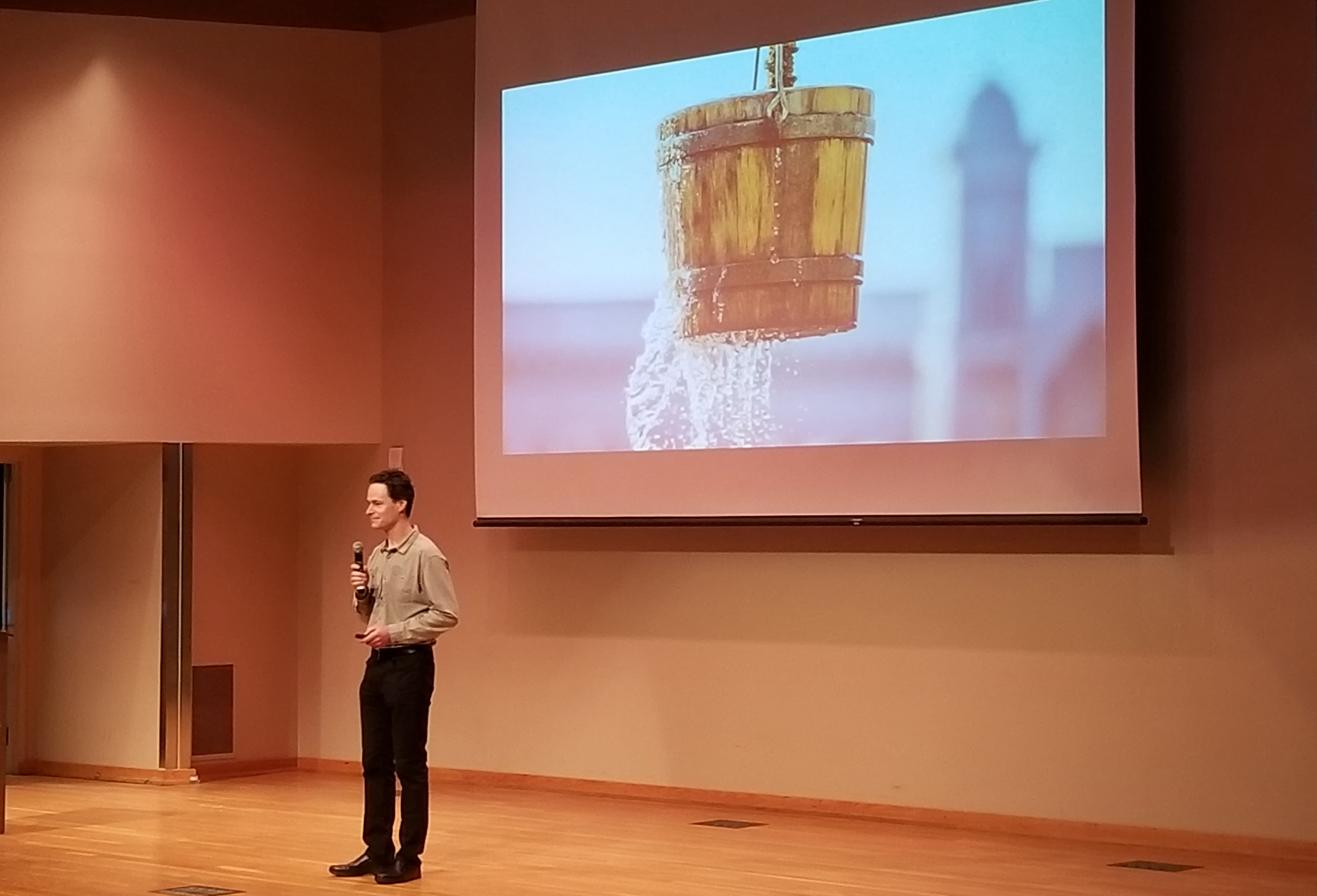 Tom Marsik compares homes to leaking buckets during his TED-style talk at Accelerate Alaska. Photo by Amanda Byrd/ACEP.