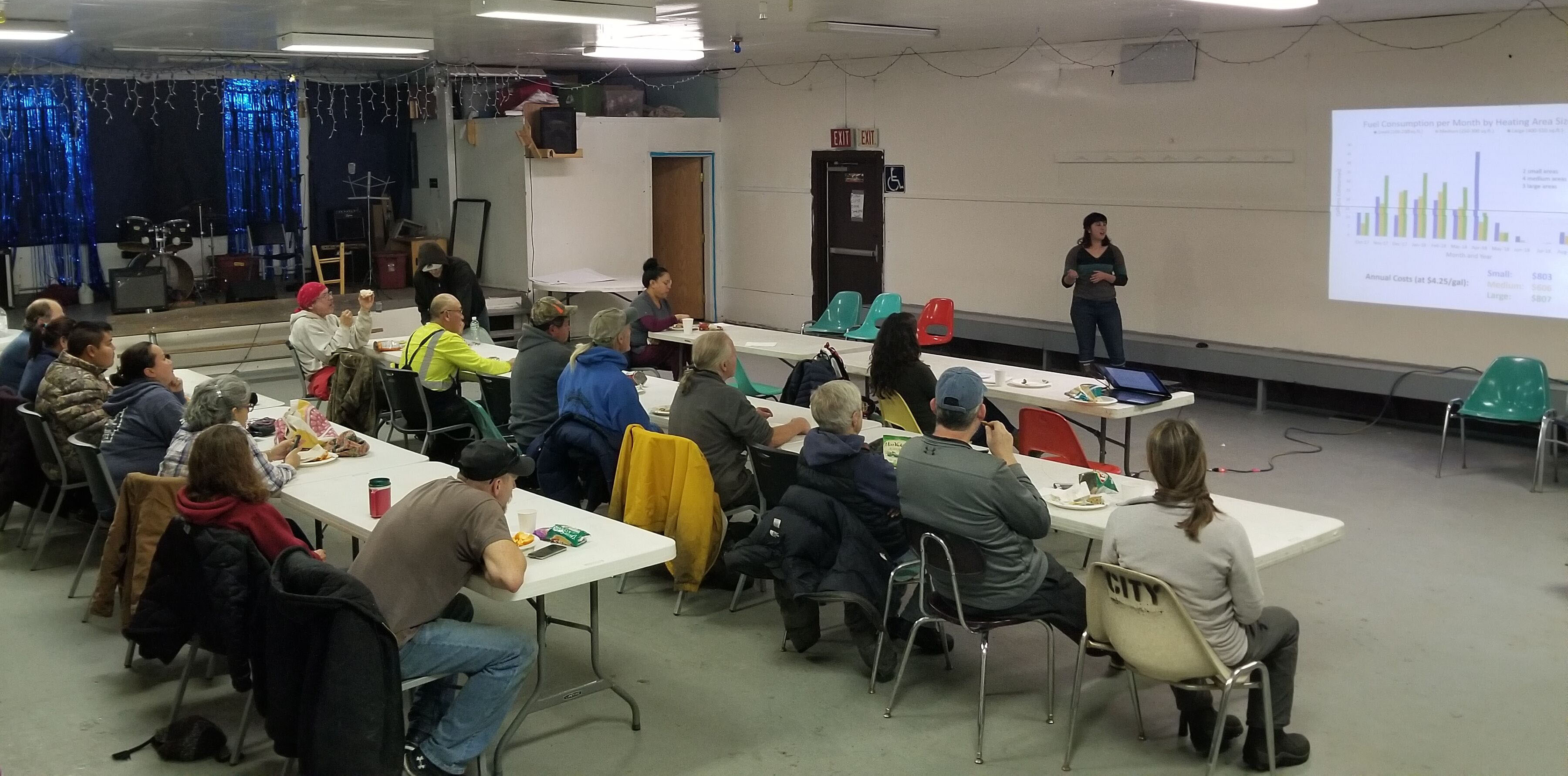 Alana Vilagi presents the first year fuel meter data to an audience of Tanana community members. Photo by Jen Schmidt.