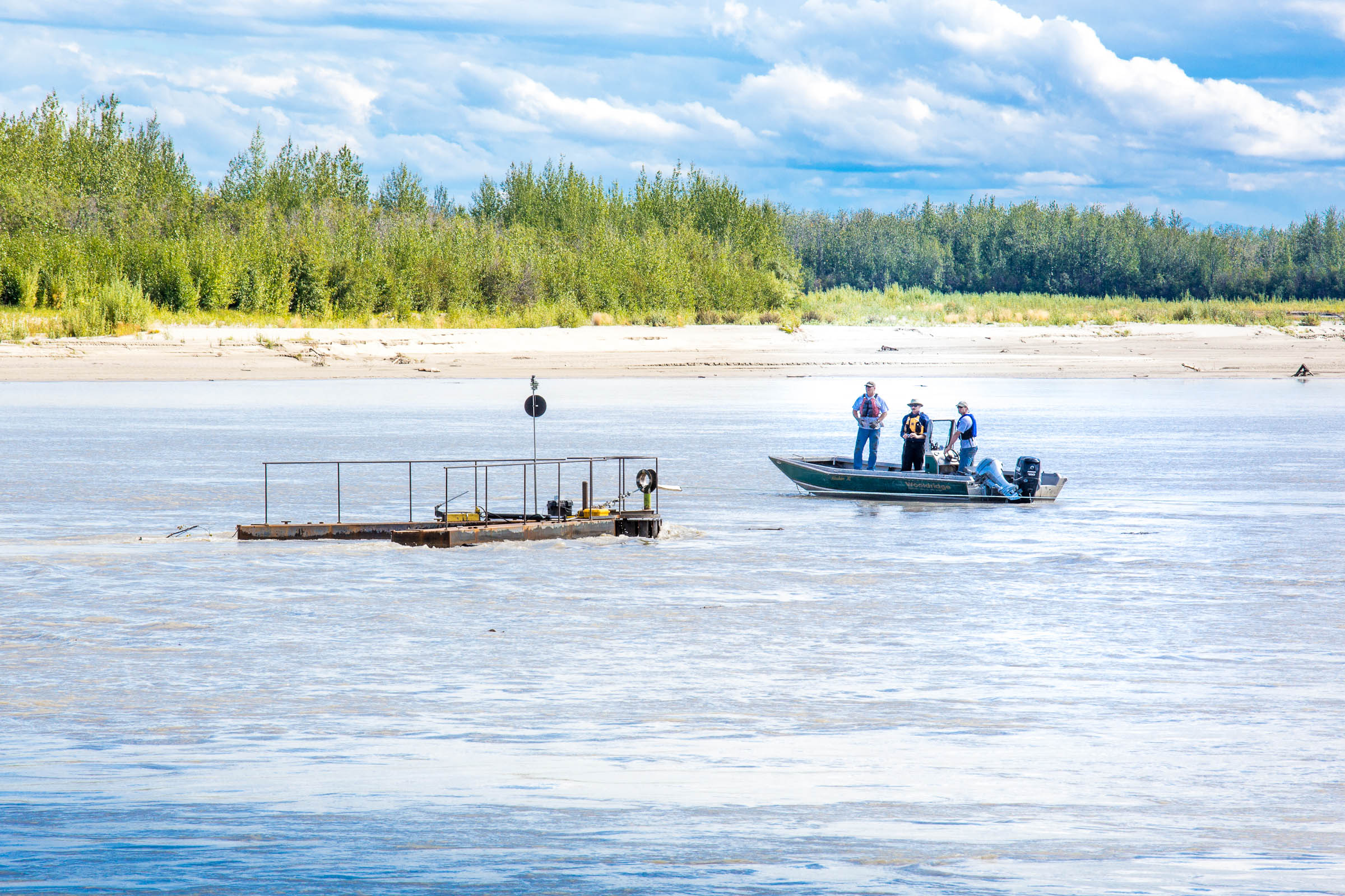 Researchers with the Alaska Hydrokinetic Energy Research Center observe the Research Debris Diversion Platform on the Tanana River near Nenana. Photo by Todd Paris/UAF.