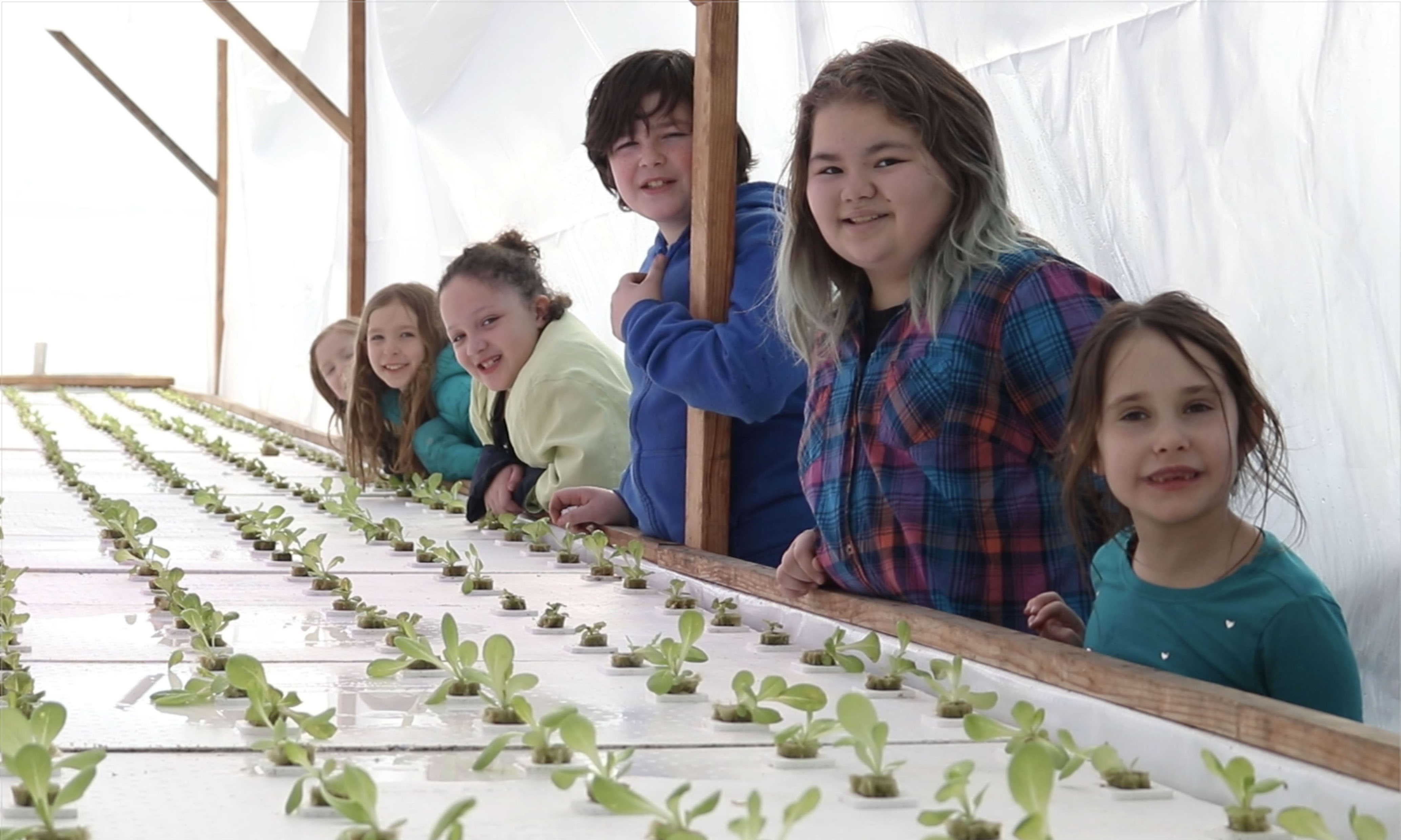 Students from Coffman Cove on Prince of Wales Island stand near a hydroponic lettuce bed. Photo by Amanda Byrd.