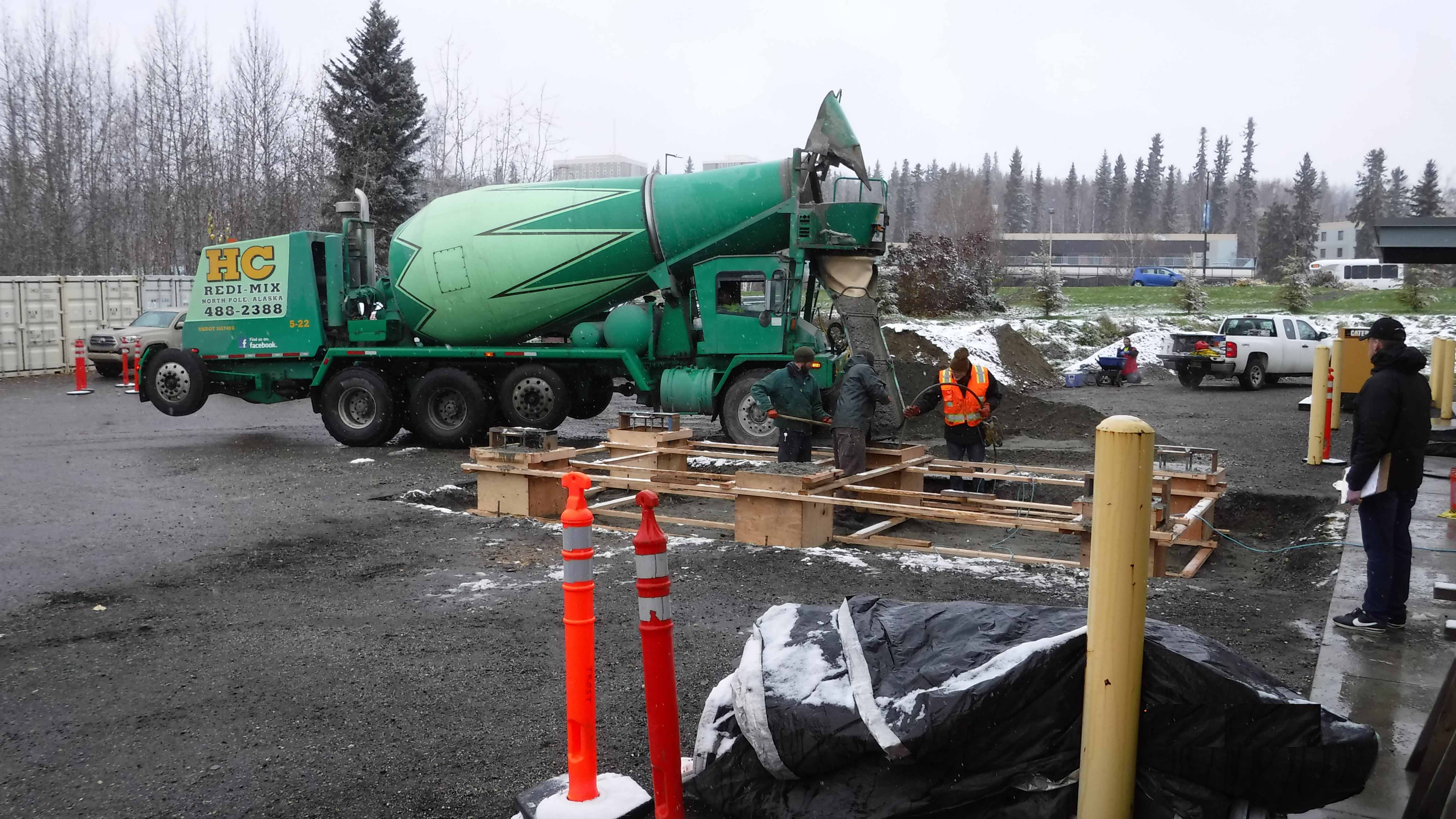 Concrete being poured for the new Saft battery foundation outside the Energy Technology Facility. Photo by David Light.