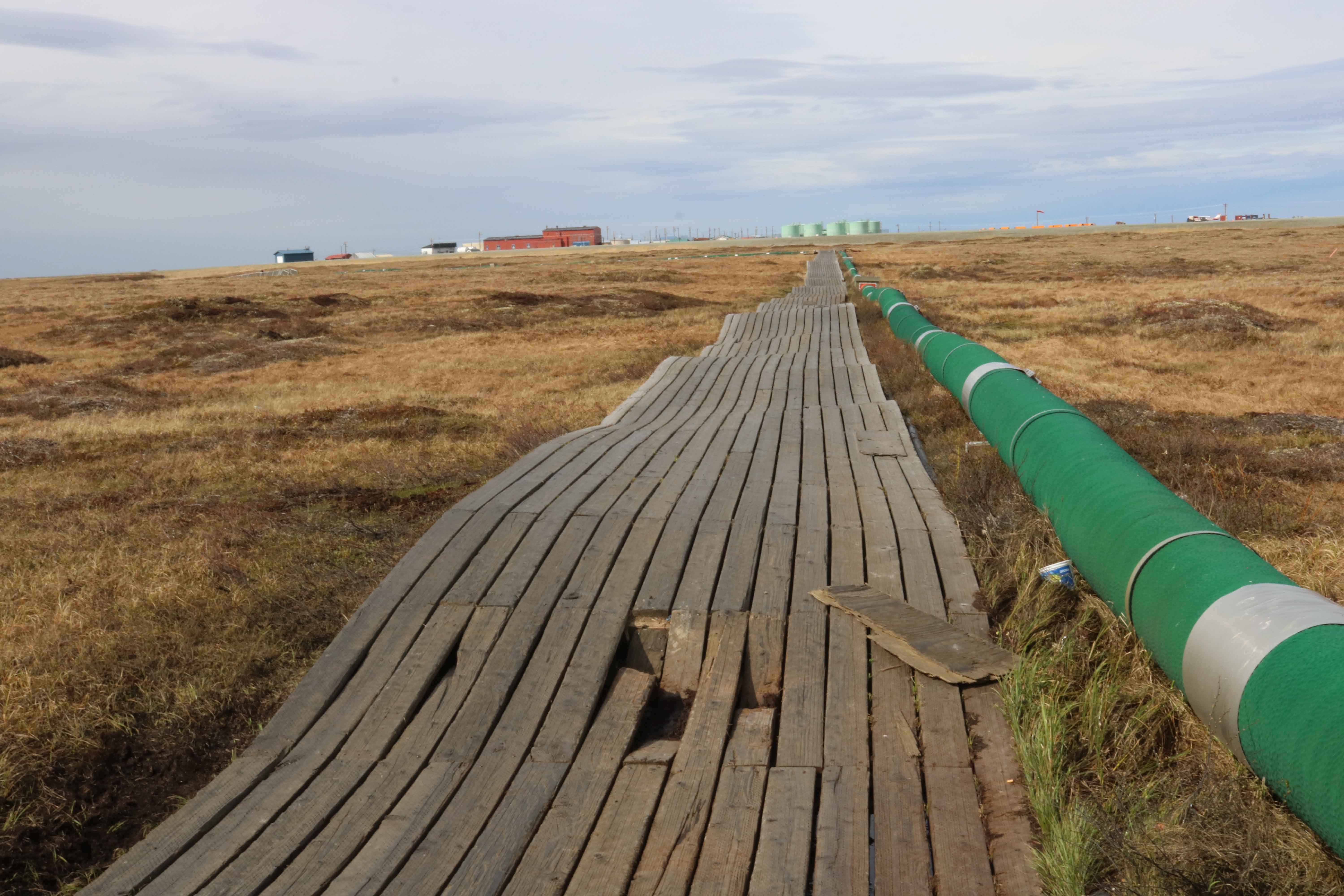Boardwalk and aboveground water pipe in Kongiganak. Photo by Amanda Byrd.