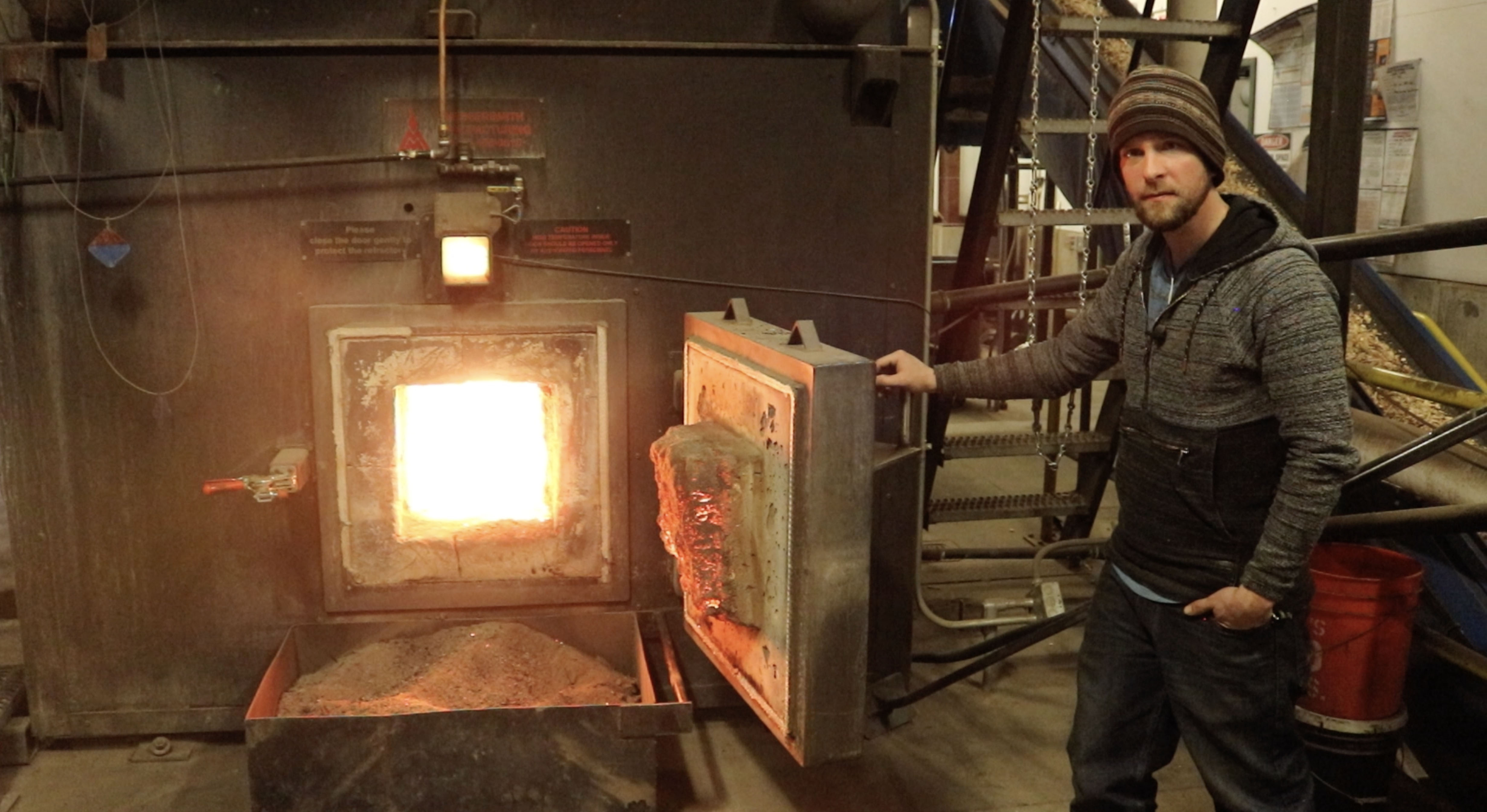 Tok School biomass boiler operator Rion Sabin opens the door of 5.5 MMBTU woodchip boiler. Photo by Amanda Byrd.