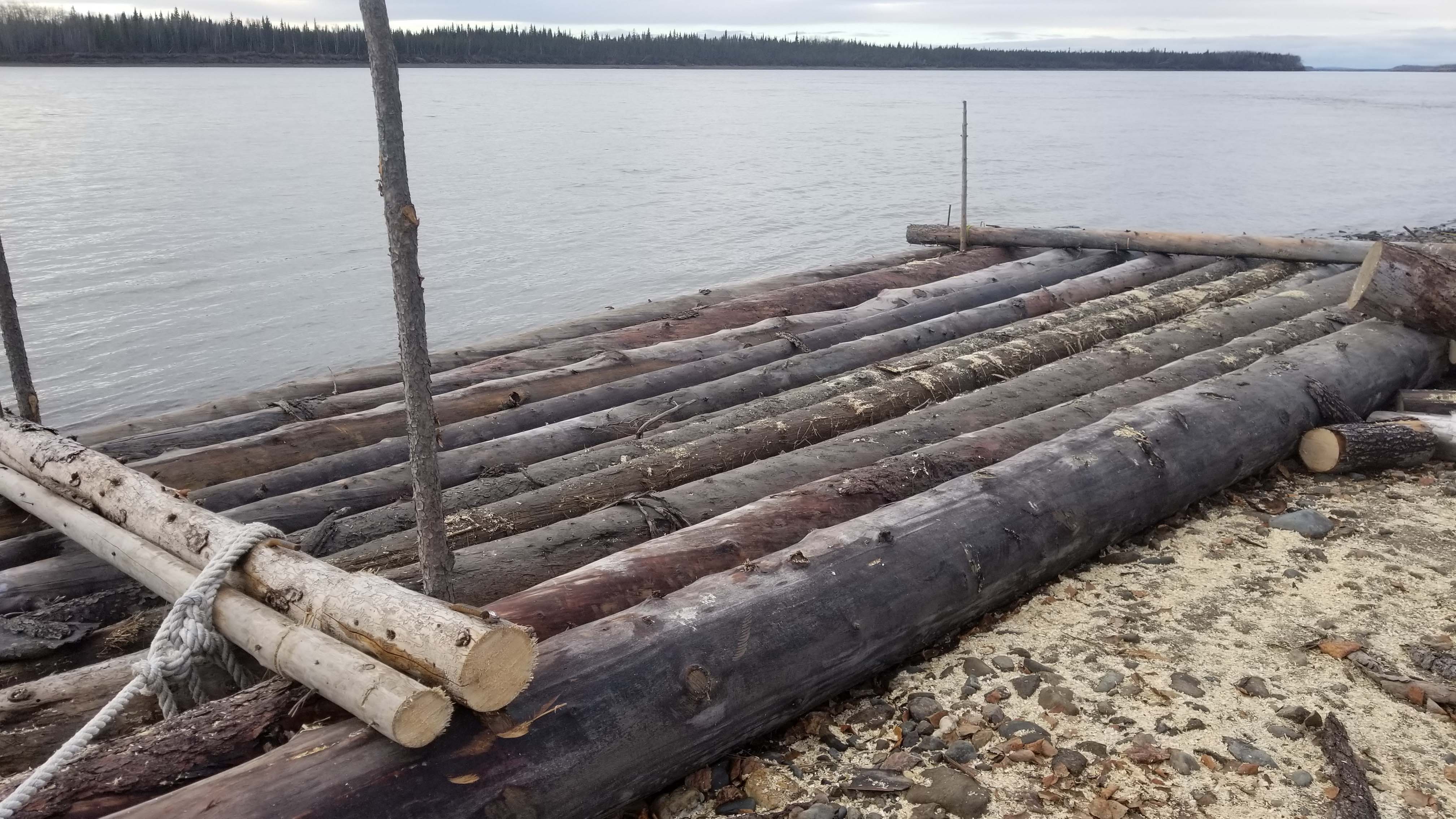 A wood raft used to transport firewood sits on the banks of the Yukon River near Tanana. Photo by Amanda Byrd.