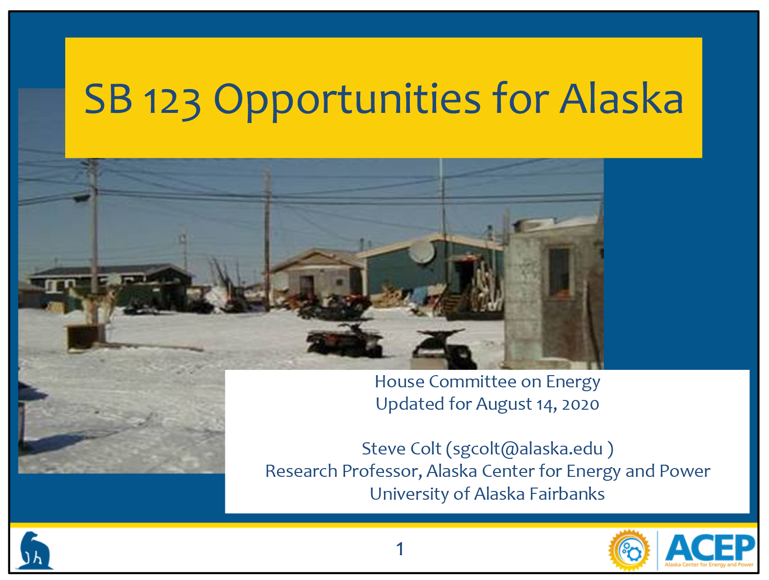 Colt’s topic was Senate Bill 123, which proposes a variety of regulatory changes for electric and telephone utilities. During the hearing, titled “Opportunities for Alaska,” Colt discussed ideas for conducting integrated resource planning and introduced experts from the Regulatory Assistance Project.