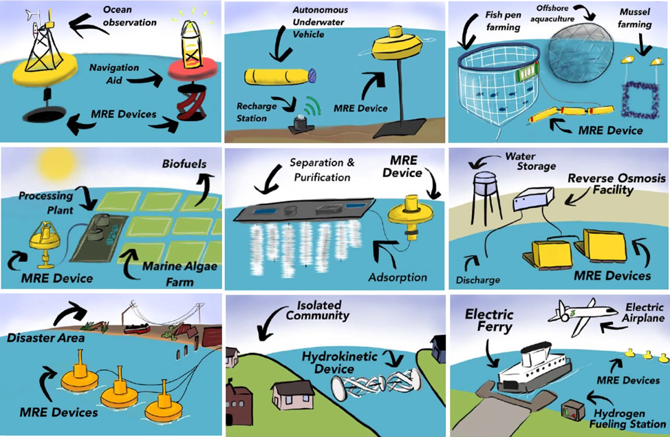 Potential Applications cartoon images from https://openei.org/wiki/PRIMRE/STEM/Marine_Energy_Collegiate_Competition_(MECC)..