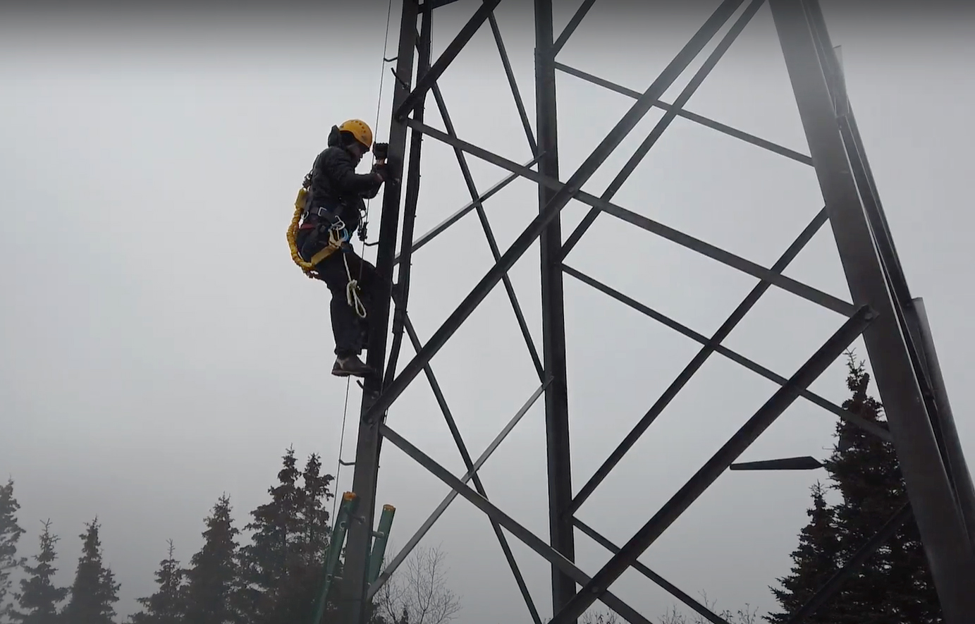 A Kokhanok resident climbs a wind turbine tower during the two-day training. Photo by Robert Bensin.