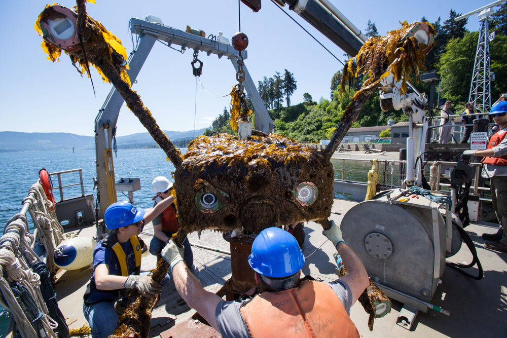 PMEC researchers handle an ocean observing platform post-deployment. Photo courtesy of PMEC.