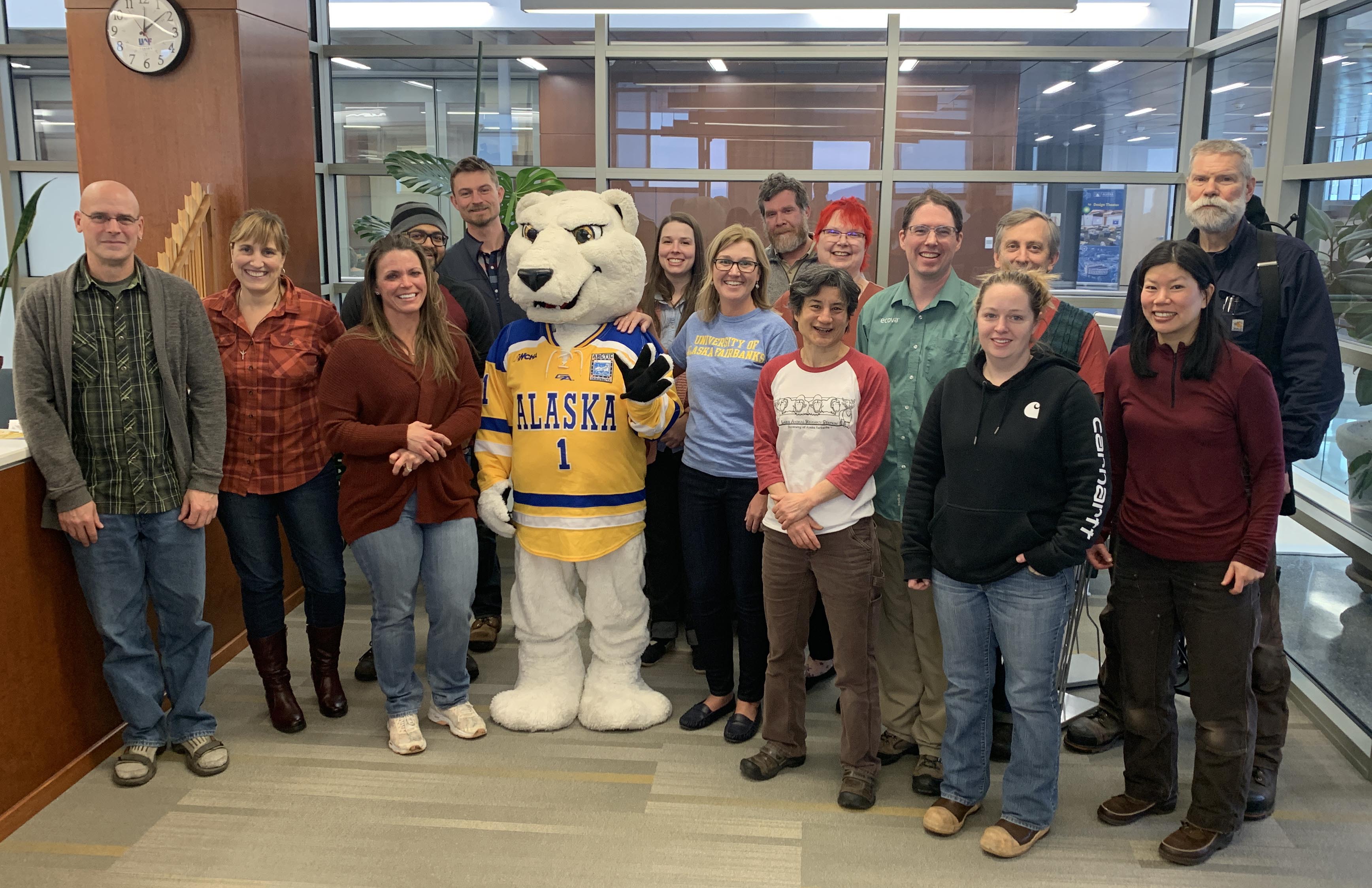 The ACEP team says farewell to Tonya Evans, standing to the left of Nook, the UAF mascot. Photo by Jill Riddle.