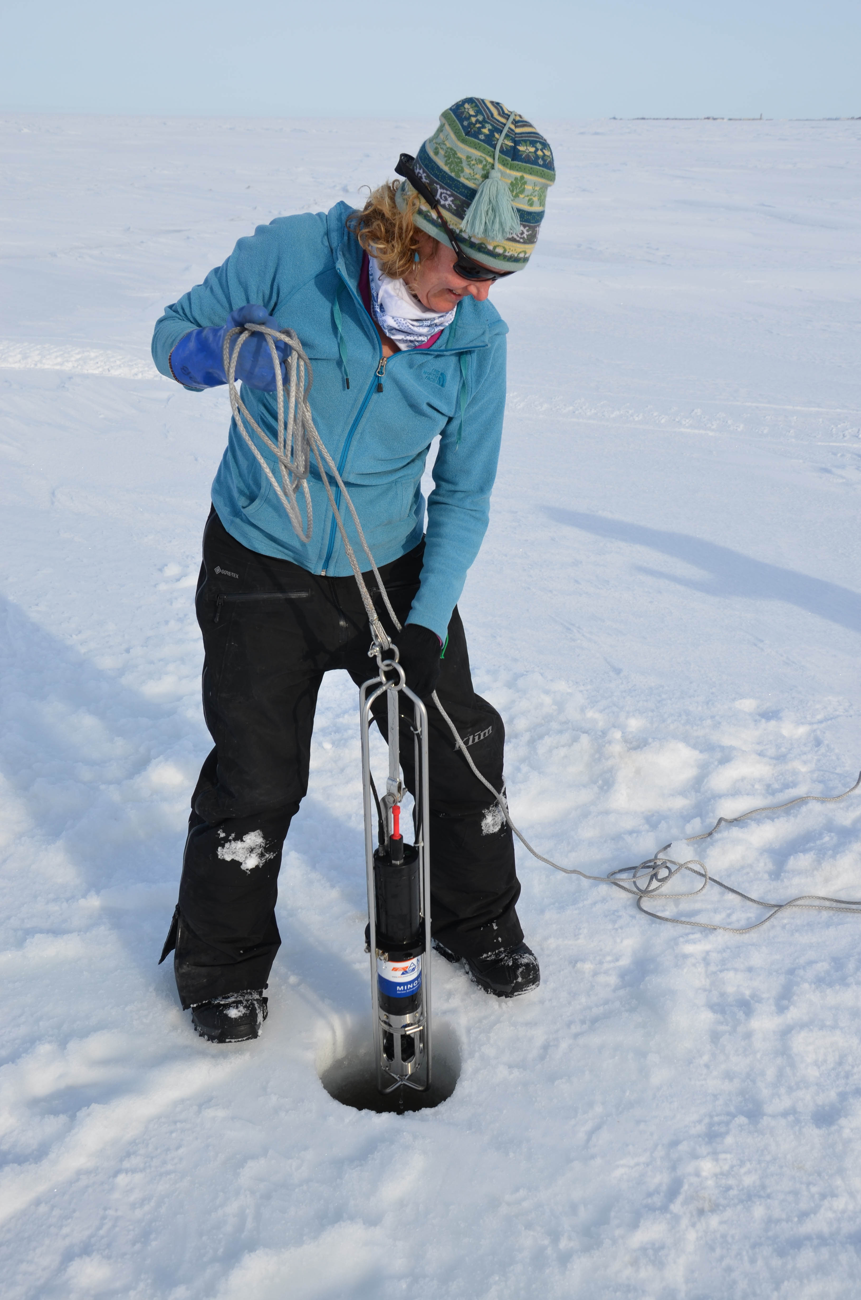 Eloise Petrone Brown lowers an instrument through the ice to measure salinity, depth and temperature of the water. Photo by Ken Dunton, University of Texas, Austin.