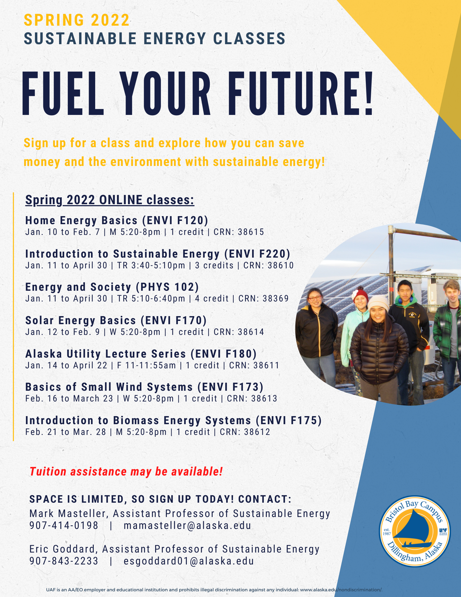 Take advantage of the new lineup of online classes offered by the UAF Bristol Bay Campus. Seven energy classes and lectures will give students a look at home energy basics, renewable energy, energy efficiency and more.