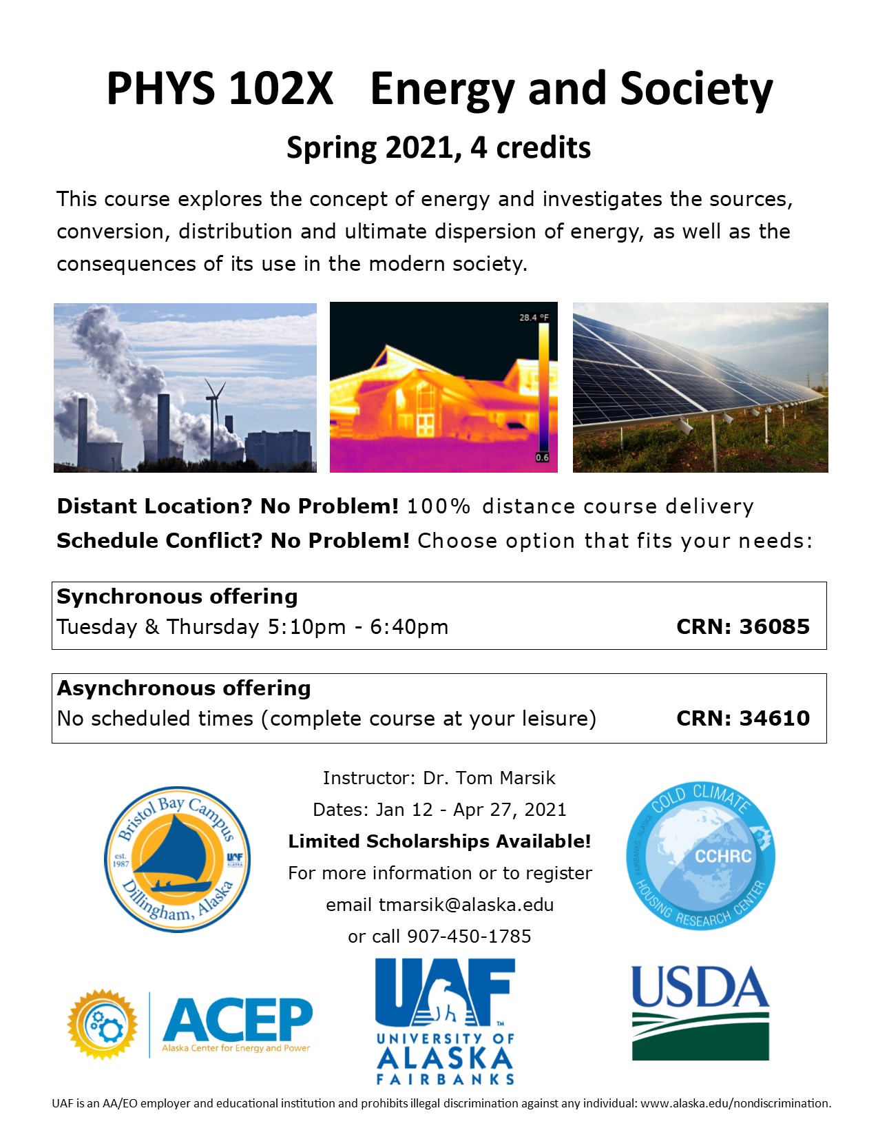 Start the spring semester off right by learning about the energy all around you! The four-credit Energy and Society class, taught by ACEP’s Tom Marsik, explores the concept of energy. The course investigates the sources, conversion, distribution and ultimate dispersion of energy, as well as the consequences of its use in the modern society.