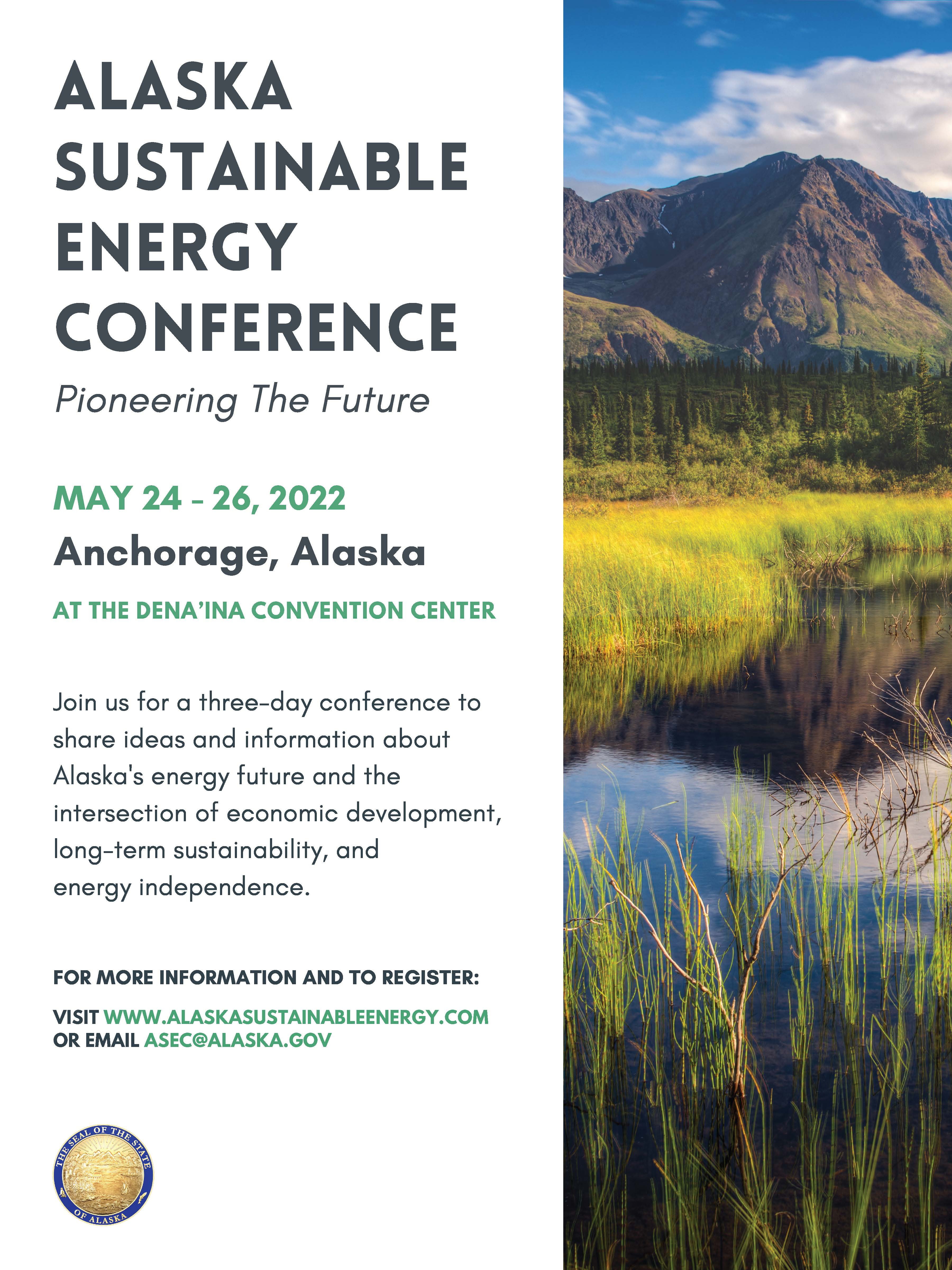 Exciting news! Mark your calendars for May 24-26, 2021, when the State of Alaska will host the Alaska Sustainable Energy Conference — a three-day event to share ideas and information about Alaska's energy future and the intersection of economic development, long-term sustainability and energy independence.
