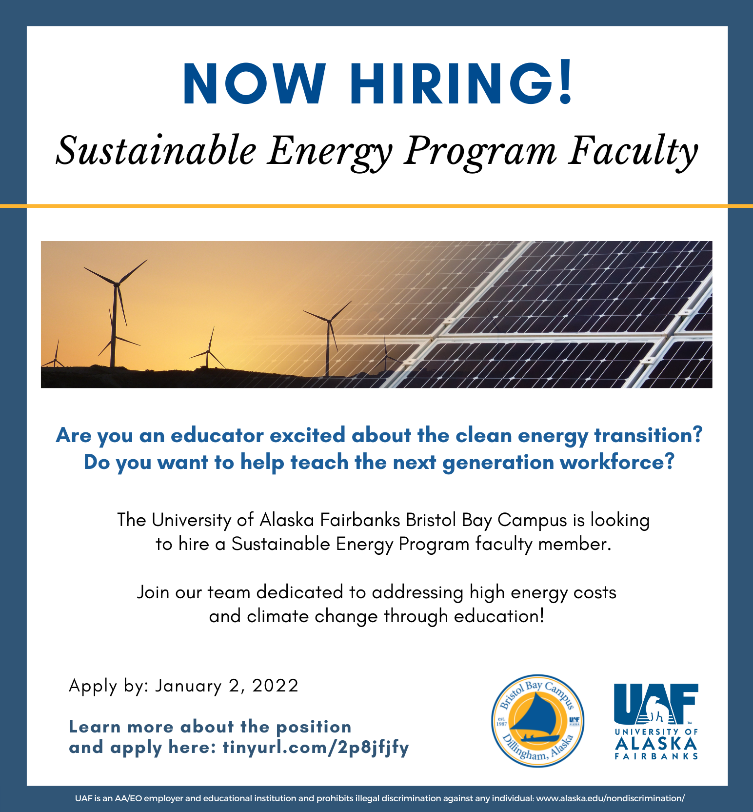 The UAF Bristol Bay Campus Sustainable Energy Program is looking for an educator who is passionate about the clean energy transition and about the role energy systems play in our changing climate.
