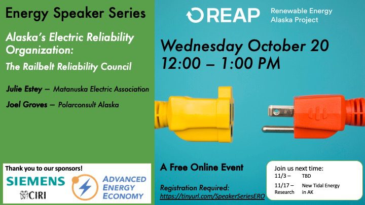Join Renewable Energy Alaska Project at noon on Oct. 20, 2021 to learn more about the status of a voluntary effort to establish Alaska's first Electric Reliability Organization in accordance with legislation (SB123) that REAP helped establish. This event is free and held via Zoom. Pre-registration is required