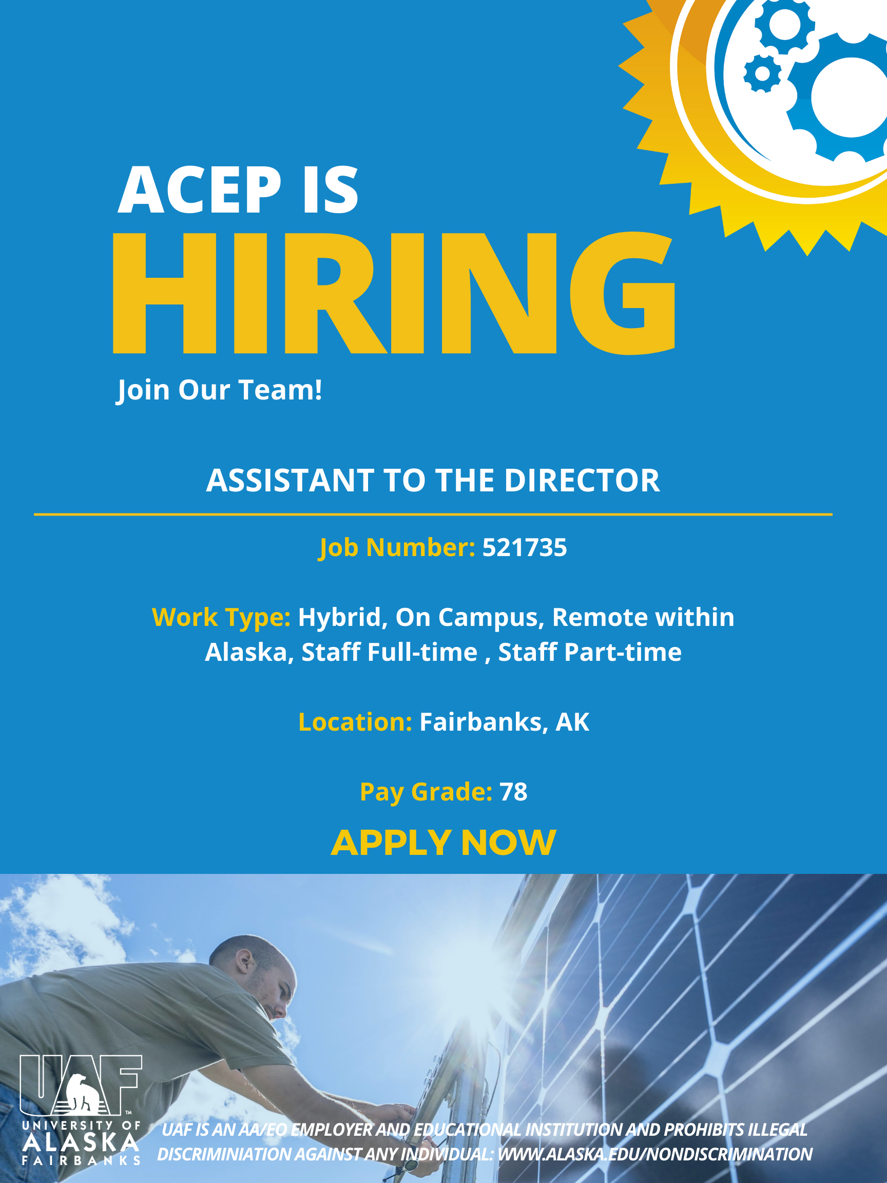Join ACEP as the Assistant to the Director! Collaborate with a diverse team of energy professionals, stakeholders, and community partners. If you are interested in joining a team that is leading the way in energy solutions for Alaska and beyond in a fun, dynamic, and supportive atmosphere we encourage you to apply!