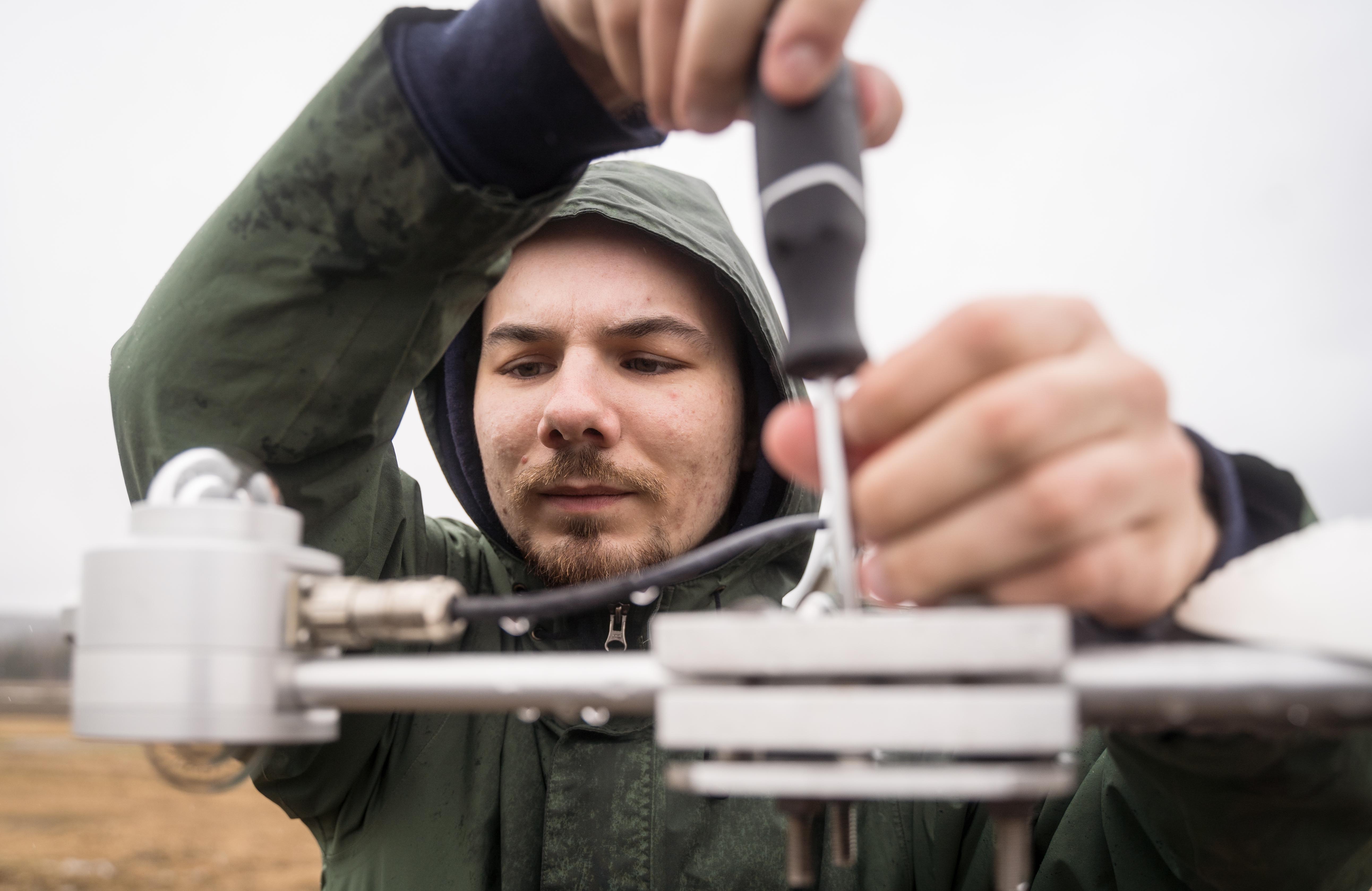 Cole Sudkamp-Walker levels an albeometer during one of his weekly trips to the solar test site, located on the UAF campus. Photo by Jeff Fisher.