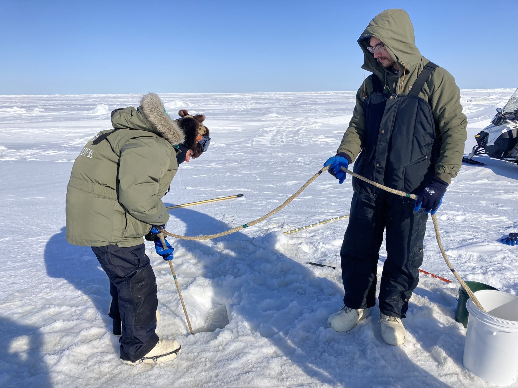 Brown and Kasper collected physical oceanographic measurements from under the sea ice at Elson Lagoon. They were accompanied by interdisciplinary team members from the University of Texas at El Paso, University of Texas at Austin Marine Science Institute, Virginia Institute of Marine Science, Oregon State University, and UAF’s Geophysical Institute and College of Fisheries and Ocean Sciences. Simpson Lagoon and Stefansson Sound, on the central Beaufort Sea coast, and Kaktovik and Jago lagoons, to the east, were sampled by other BLE LTER team members over the same time period.