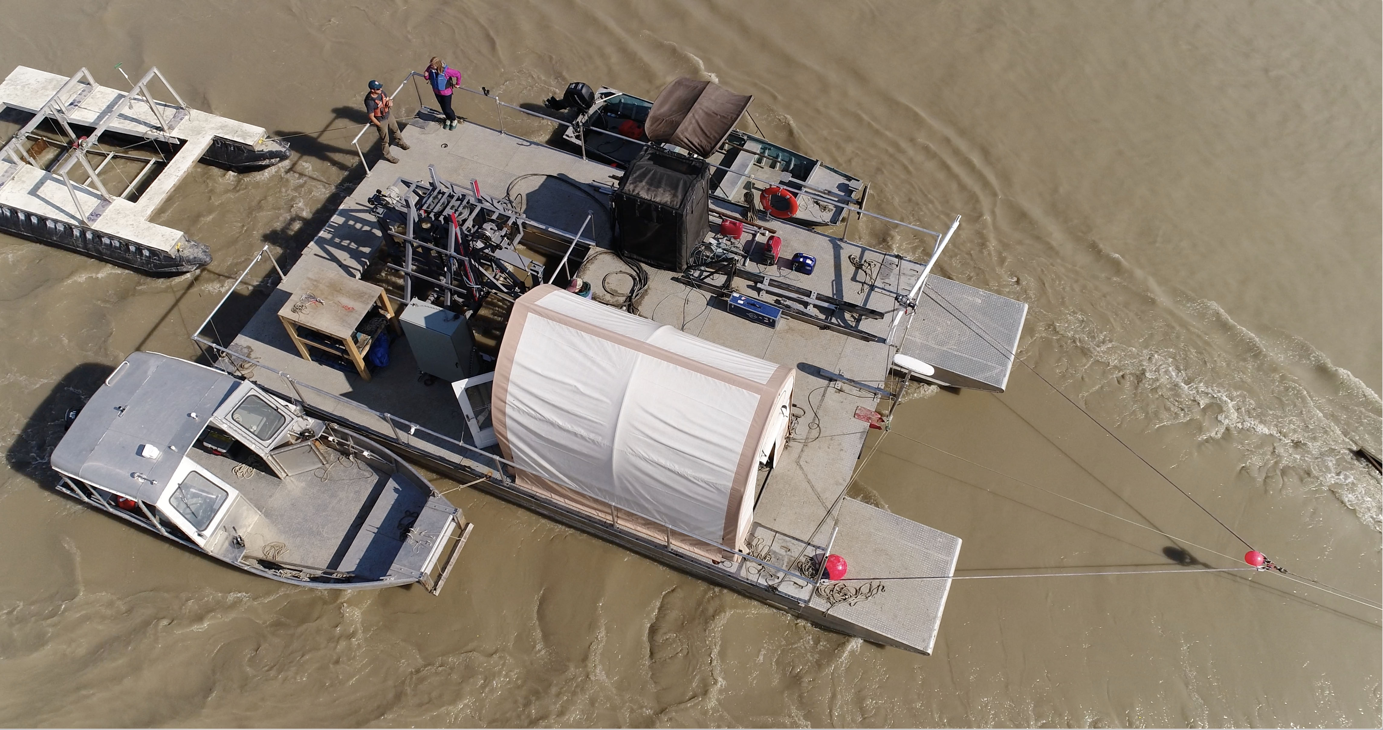 The water horse hydrokinetic device is tested at the Tanana River Test Site near Nenana in 2021. Photo by Amanda Byrd.