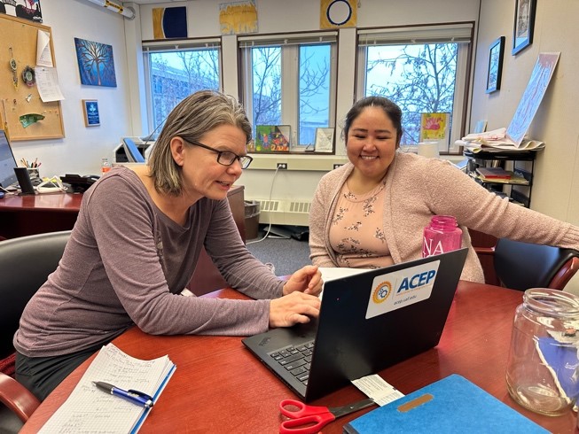 ACEP research engineer Michelle Wilber, left, shows the Alaska Electric Vehicle Calculator to Minnie Naylor, the UAF Chukchi Campus interim director. Photo by Jen Schmidt.
