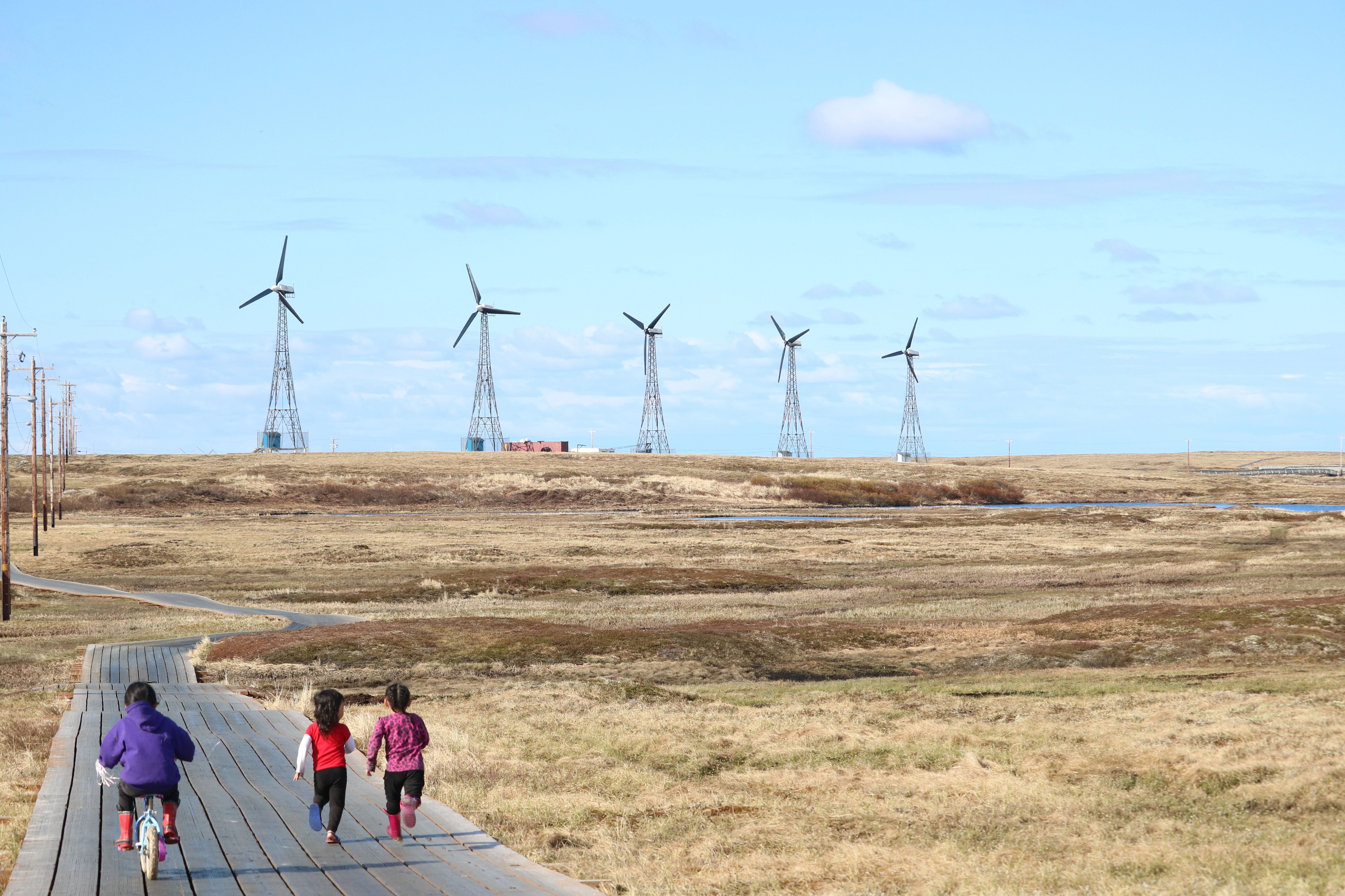 Byrd earned second place for a photo taken in Kongiganak during her first ACEP storytelling assignment in 2017. It shows children running along a boardwalk in the village with the community’s 475 kw wind farm in the distance.