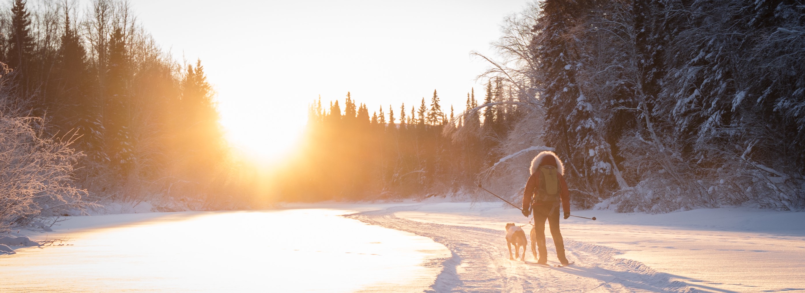 ACEP's Erin Trochim skijor on the sunlit Chatanika River with her two Alaskan huskies. Photo by Jeff Fisher
