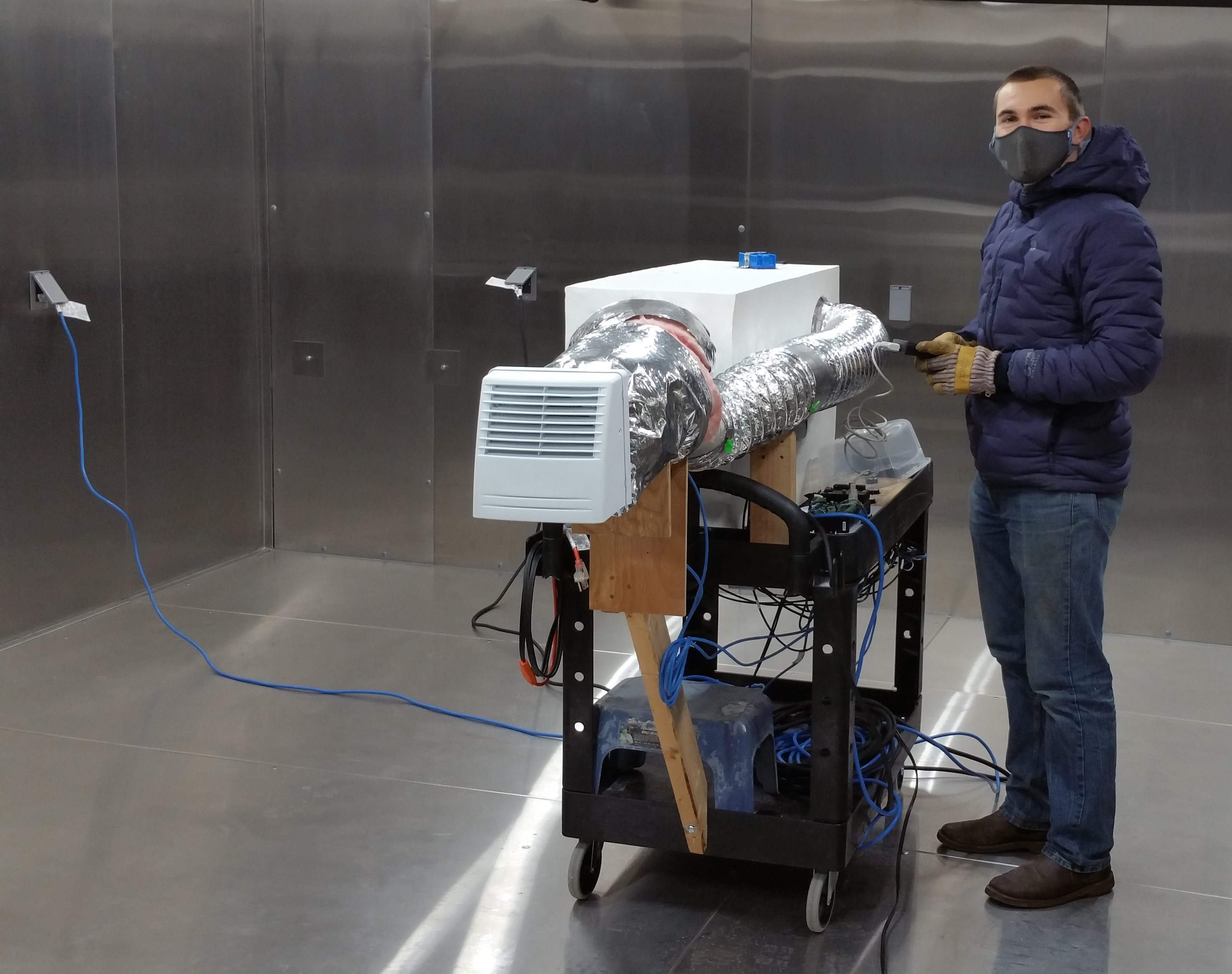 Riley Bickford stands in UAF’s cold chamber at minus 40 F next to the Dual Hood heating and recovery ventilation system he developed with Tom Marsik as part of his master’s degree project. Photo by Tom Marsik.
