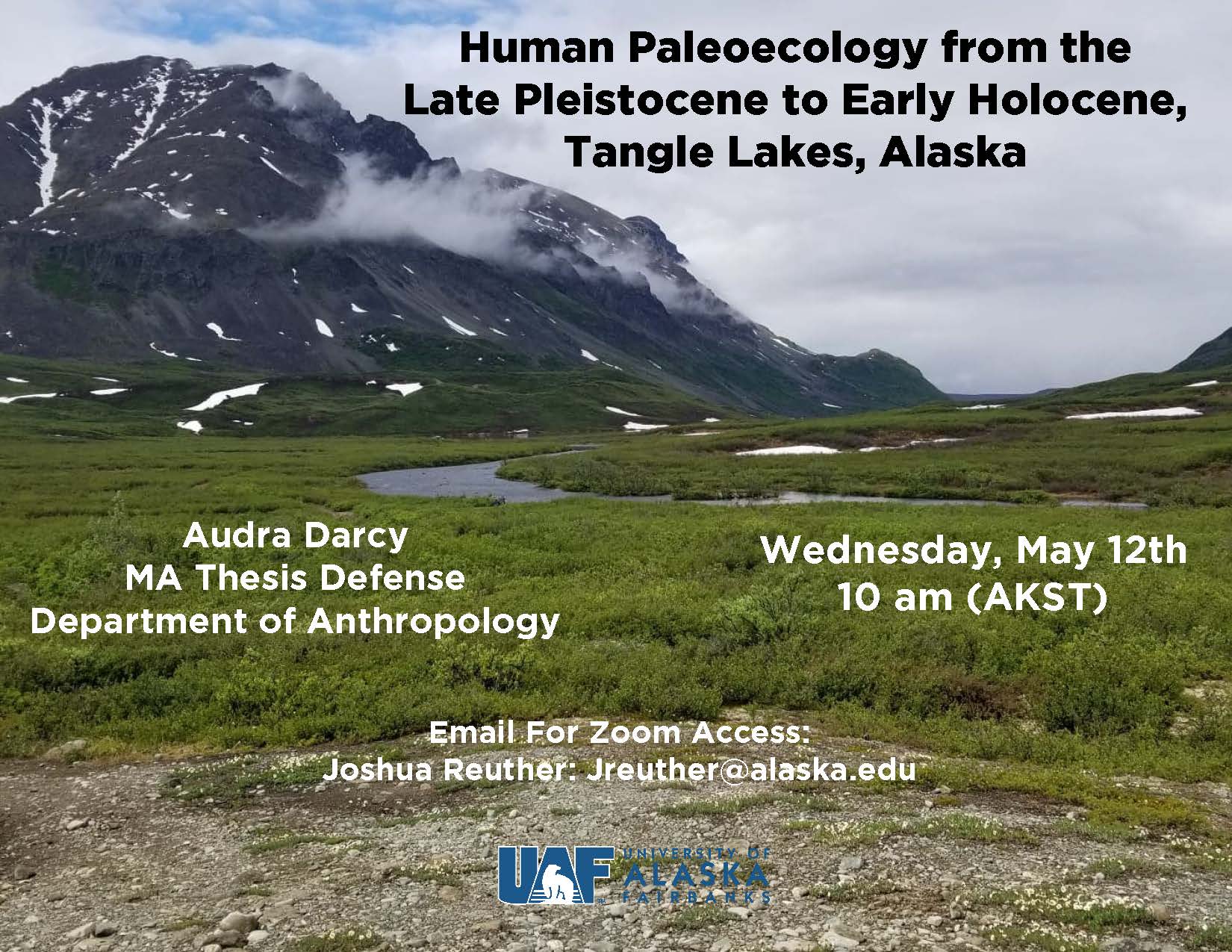 Wednesday, May 12, 2021 at 10:00AM Alaska timeAudra Darcy MA Thesis Defense Human Paleoecology from the Late Pleistocene to Early Holocene, Tangle Lakes, Alaska This study examines paleoenvironmental change from the Late Pleistocene to Early Holocene in the Tangle Lakes region of interior Alaska to explore changes in resource distribution and impacts on prehistoric hunter-gatherer subsistence patterns in upland settings (>500 masl). In interior Alaska, prehistoric hunter-gatherer subsistence economies were organized around the procurement of large herbivores (bison, caribou, elk, and moose), which were primarily regulated by habitat availability. Changes in habitat availability altered the distribution of key faunal resources, necessitating shifts in land-use strategies. The palaeoecological chronology from Glacier Gap helps contextualize resource distribution within dynamic landscapes by identifying changes in habitat availability for grazing, mixed-feeding (bison, caribou, elk), and browsing (moose) herbivores. This study applies pollen analysis, as well as carbon and nitrogen isotope analysis, of lake and peat deposits to reconstruct paleoenvironmental change from~14,000 to ~6,000 Cal yr BP. Results indicate grazing habitats persisted until approximately ~13,500 Cal yr BP which allowed for initial expansions of bison and elk, but habitats became mixed following the appearance of birch shrubs. Existing archaeological data indicate that initial use of upland regions coincided with expansion of bison and elk habitat, which would have represented large-bodied, predictable sources of food. As shrubs continued to expand, grazing and browsing habitats became increasingly fragmented in a mix-feeding period between ~13,000 to ~10,000 Cal yr BP. Fragmentation of bison and elk habitats made these species less predictable on the landscape, which likely led to the abandonment of the Tangle Lakes. A shift from mixed-feeding to browsing habitats occurred with increasing shrub growth and the expansion of peat following the Holocene Thermal Maximum approximately ~10,000 Cal yr BP, supporting caribou and moose populations. Settlement patterns indicate re-occupation of the Tangle Lakes, and intensified use of uplands, possibly on an annual basis, when browsing specialists became more predictable, and settlement patterns shifted to the procurement of caribou ~6,000 Cal yr BP. Taken together, grazing and browsing habitats represent homogenous environments where resources were more abundant and predictable for hunter-gatherers, while mixed-feeding habitats represent heterogenous environments where herbivores were fragmented and less abundant or predictable on the landscape -