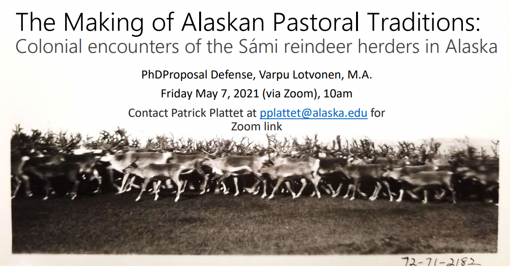 May 7, 2021Abstract: In the late 1800s, two groups of Sámi people came to Alaska to teach reindeer herding to Alaska Native peoples. Thus, they became entangled with colonization and cultural assimilation schemes of the U.S. government. The immigrants’ contribution to the development of reindeer herding, as well as their experiences as Indigenous and colonized people, has not been fully addressed in the literature regarding reindeer herding in Alaska. The proposed research sheds light on the little-known stories of Sámi reindeer herders in Alaska by examining archival and bureaucratic materials and through photographic elicitation fieldwork in Alaska and northern Fennoscandia. A main objective is to build a nuanced understanding of the colonial encounters between the Alaska Sámi and the Native and non-Indigenous peoples who were involved in the Alaska Reindeer Project (ARP). In contrast to earlier essentializing narratives about the Alaska Sámi, this research focuses on their lived experiences within a nexus of colonial encounters. Methodologically, it applies the New Rhetoric textual analysis framework onto written materials to elucidate the cultures of colonialism. An important aspect of the research is its collaborative dimension: Preliminary findings as well as archival photographs will be discussed with Sámi local knowledge experts in Guovdageaidnu (Kautokeino), Norway, during fieldwork. Along similar lines, another objective is to share the archival materials that are examined in the context of this research with contemporary Sámi communities. -