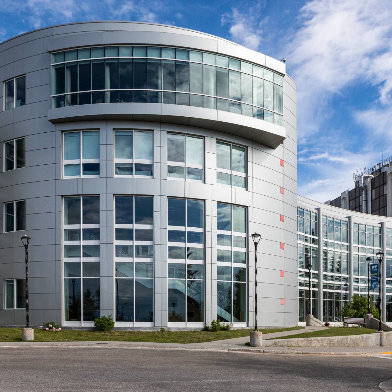 The five-story 100,000-square-foot building, which sits on the northwest corner of West Ridge, opened in 1999. The building houses the International Arctic Research Center and other UAF departments, as well as offices for the National Weather Service and the 60,000-volume Keith B. Mather Library.