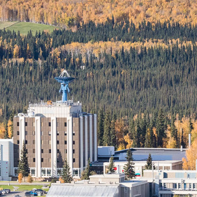 The blue satellite-tracking antenna, with a diameter of 29.5 feet, was hoisted atop the building in March 2017, replacing one from 1987. It and two 11-meter antennas in nearby woods receive synthetic aperture radar data from polar-orbiting satellites. UAF operates the Alaska Satellite Facility for NASA. A weather and gamma radiation monitor also sits atop Elvey, and another is in the hills nearby. They gather data for UAF, Los Alamos National Laboratory and the Alaska Department of Environmental Conservation.