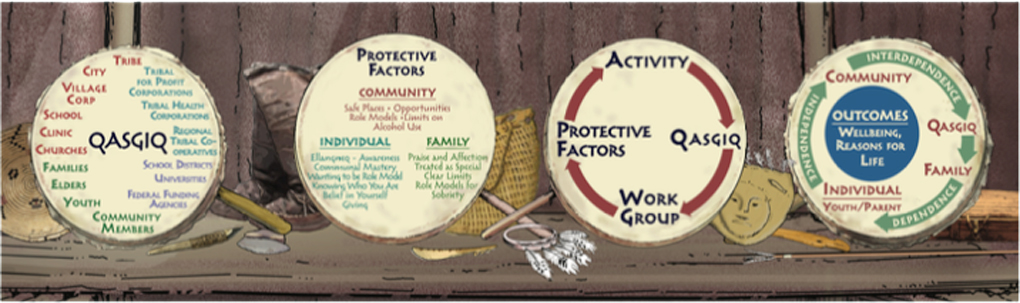 A work group involves the community Elders, adult and youth who plan out the process for building strengths and protections for youth through engagement in the traditional Yup’ik activities. Youth, Elders and community members assess progress towards outcomes by tracking movement in a Yup’ik cycle of healing and development.