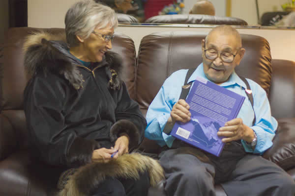 Wesley Aiken holds the Iñupiaq to English Dictionary while talking with Edna MacLean in Utqiagvik in November. MacLean consulted with Aiken to verify words in the dictionary. Ella Quimby photo