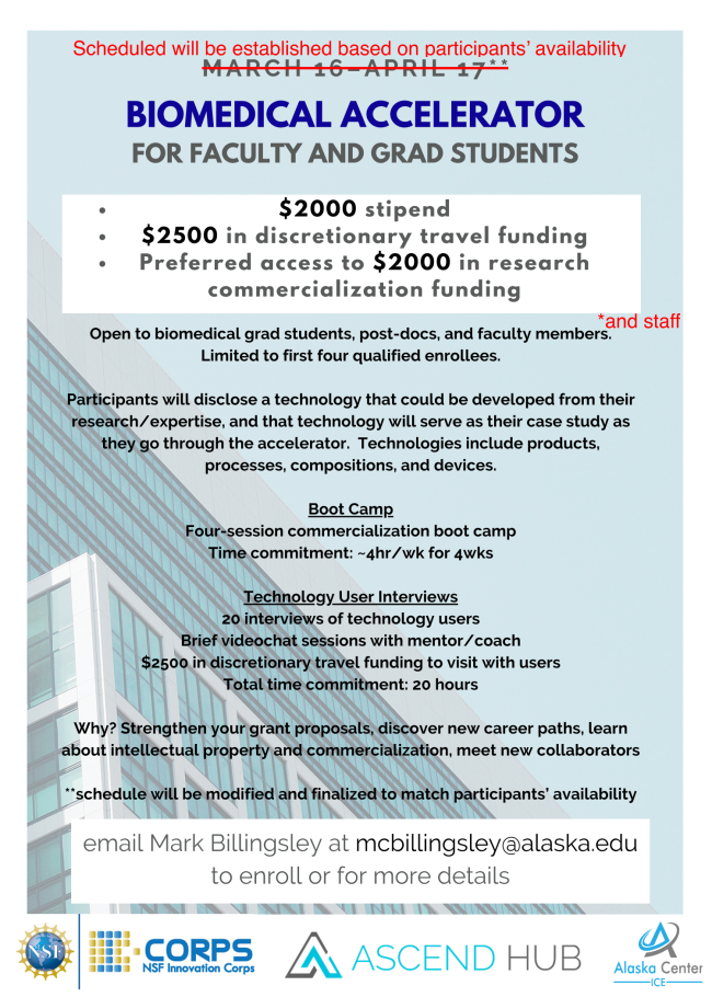 This accelerator program is sponsored by National Science Foundation Innovation Corps, Ascend Hub, and Alaska Center ICE.